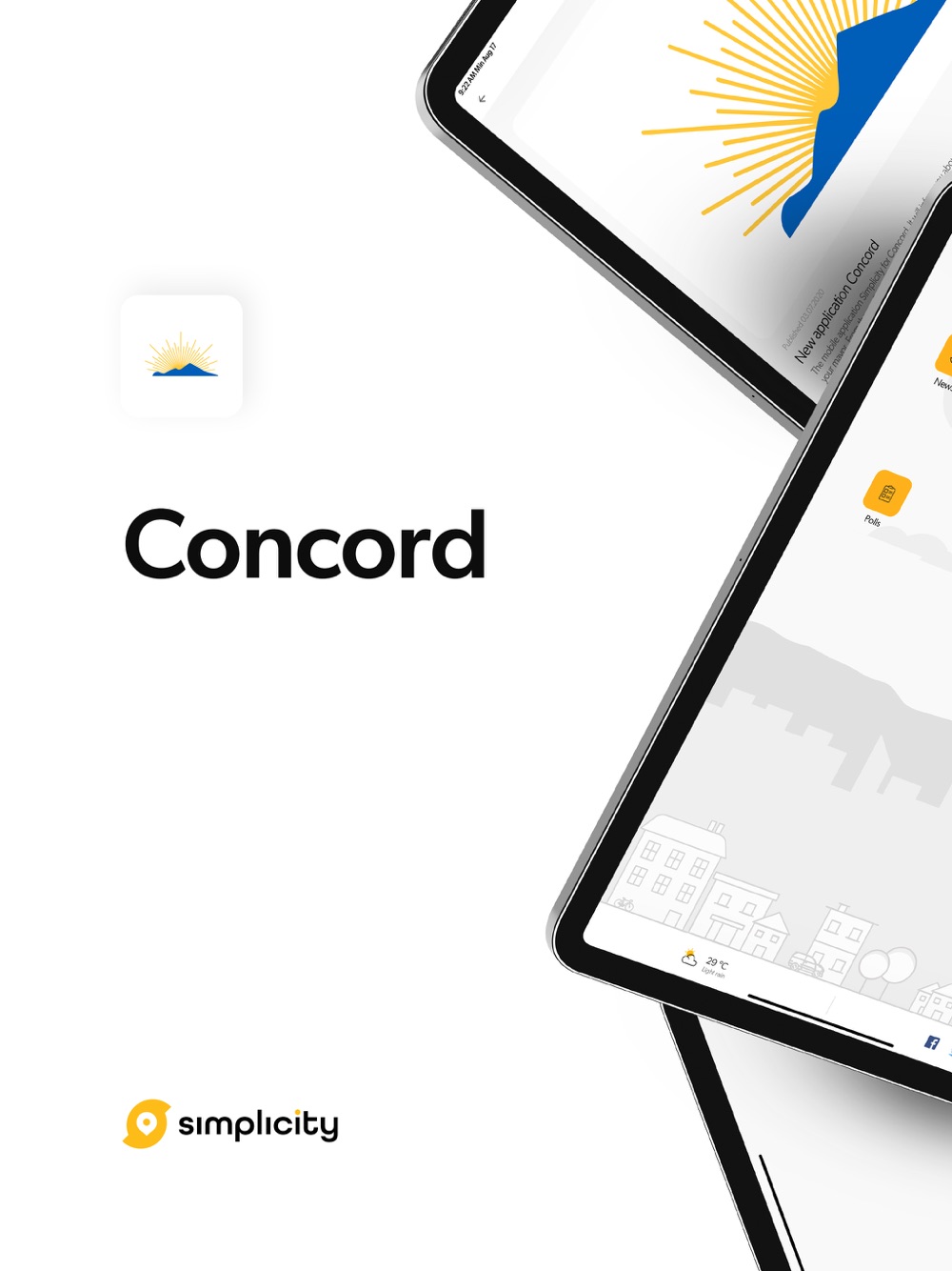 Simplicity mobile application for Concord. It will inform you about news in your city and announcements from your mayor. From the application, you can also directly contact the city office or the mayor and they can get back to you too.