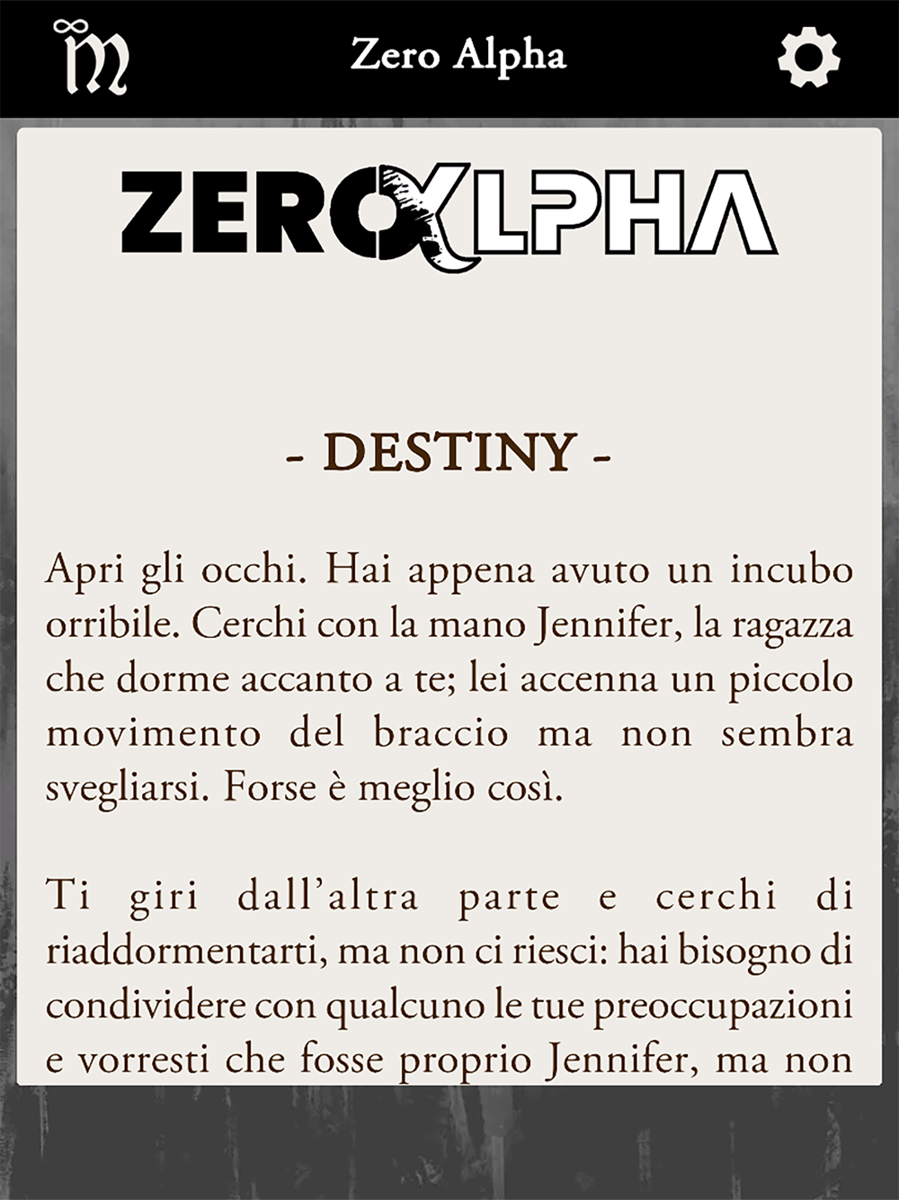Zero Alpha - Destiny è una storia a bivi in cui il protagonista sei TU! Trova il sentiero migliore e prova a cambiare il corso degli eventi, sconfiggi tutti i tuoi nemici e scopri dove si trova il punto Zero Alpha!