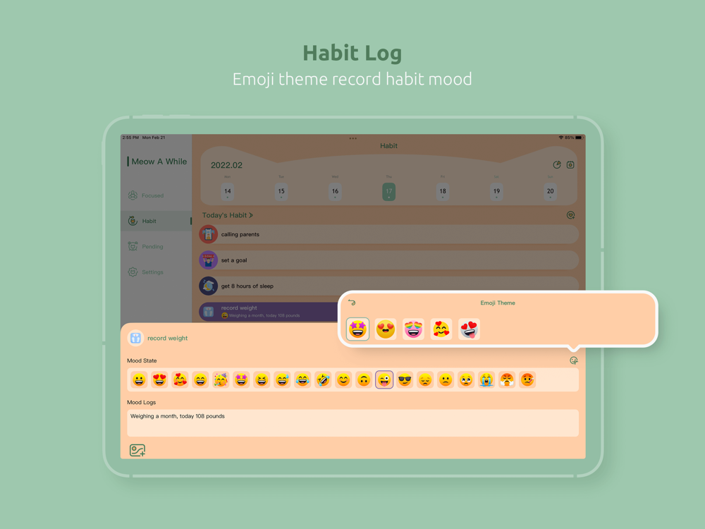- Habit log: you can choose different Emoji emoji and support uploading pictures
