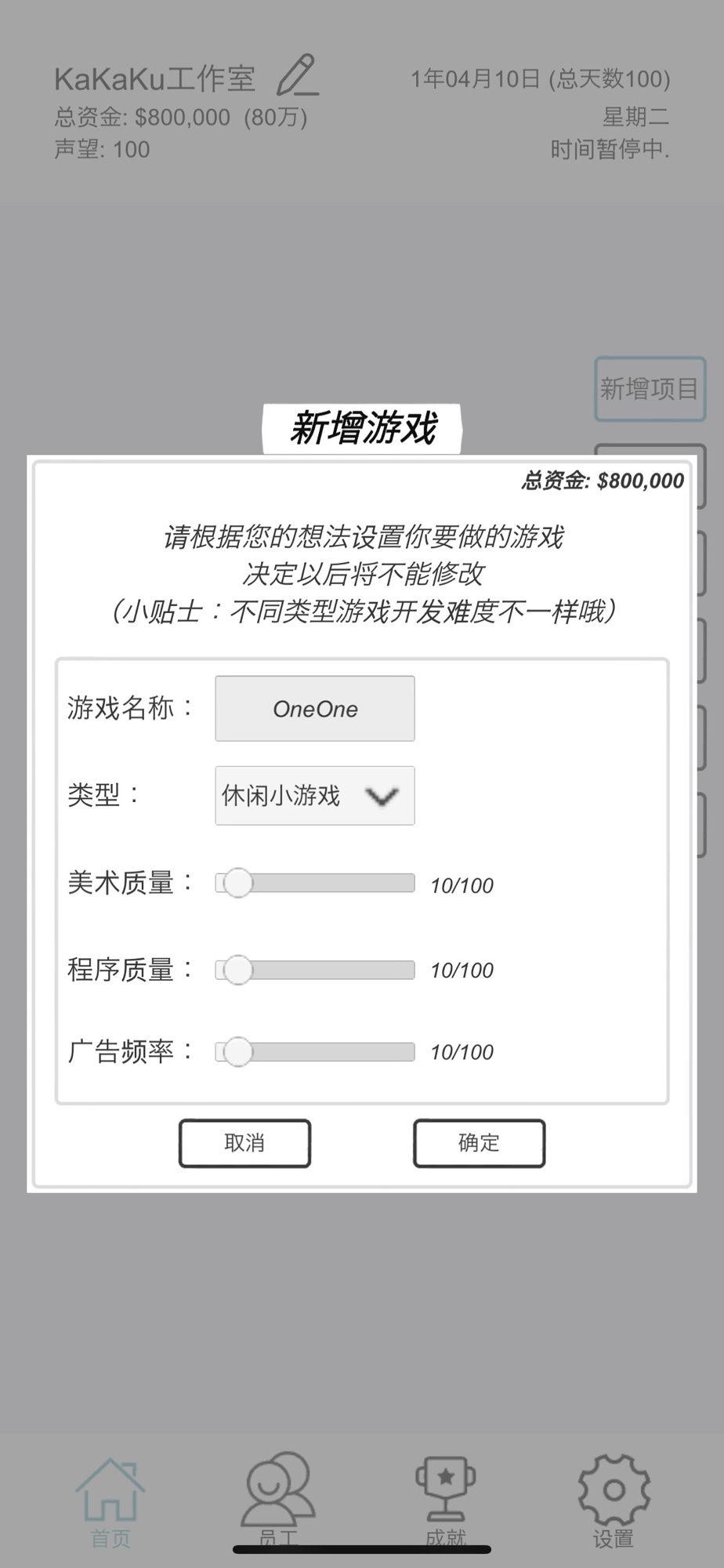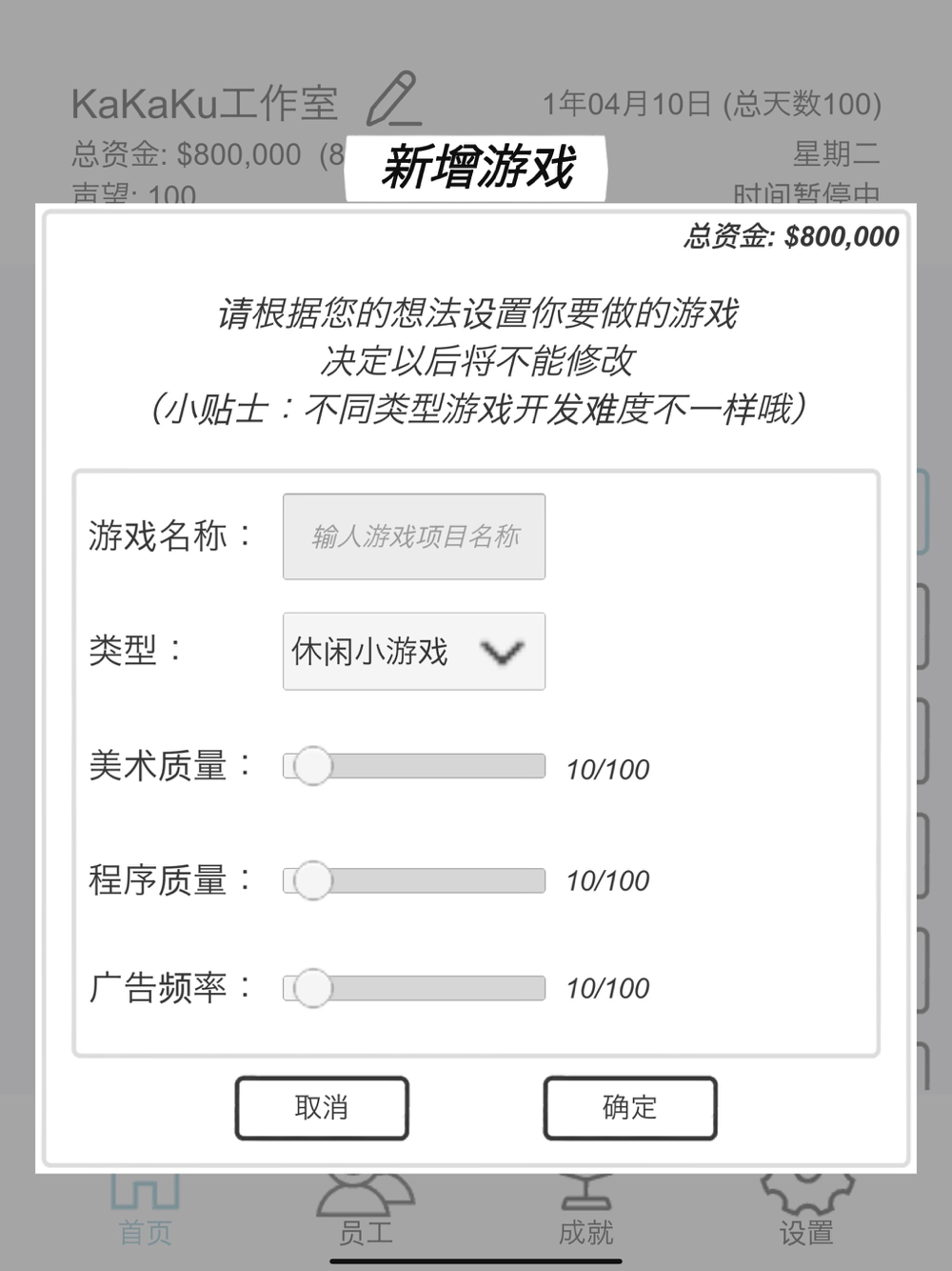 在本游戏中,玩家将扮演一名独立游戏开发者:通过做游戏,然后在游戏内部置入广告赚钱养活自己(包括自己建立的工作室)!!!那么你该如何取舍呢?你会选择“用爱发电”吗?