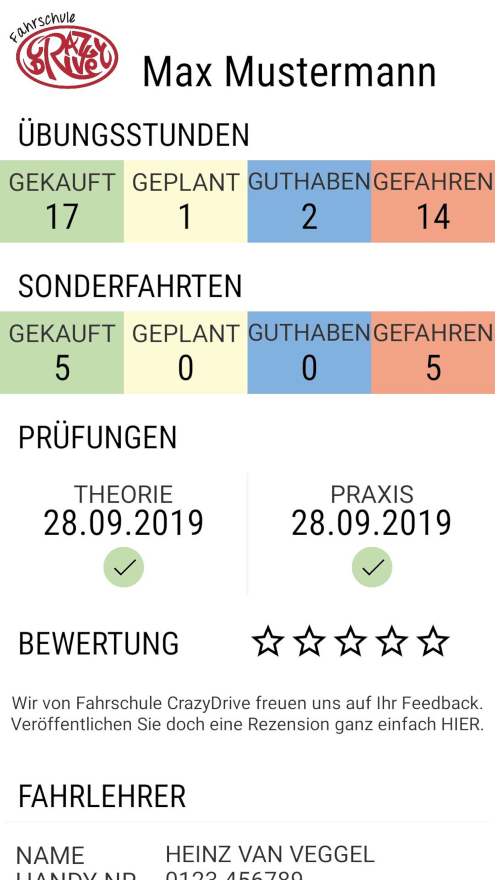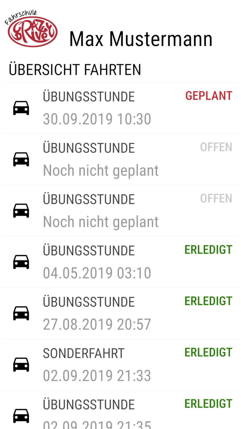 • Übersicht über die Anzahl der gekauften, gefahrenen und noch zur Verfügung stehenden Übungs- und Sonderfahrten