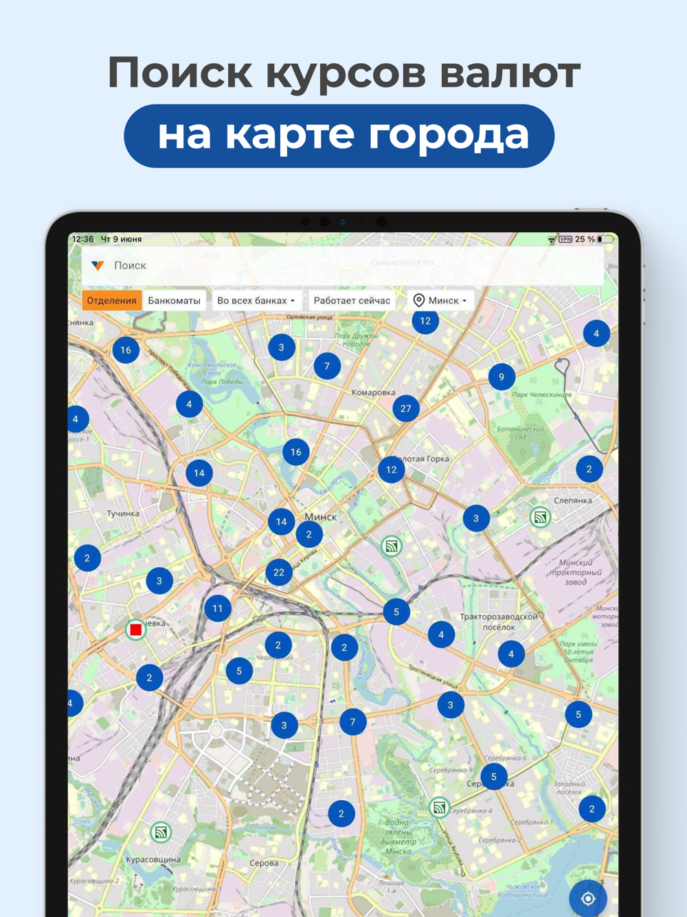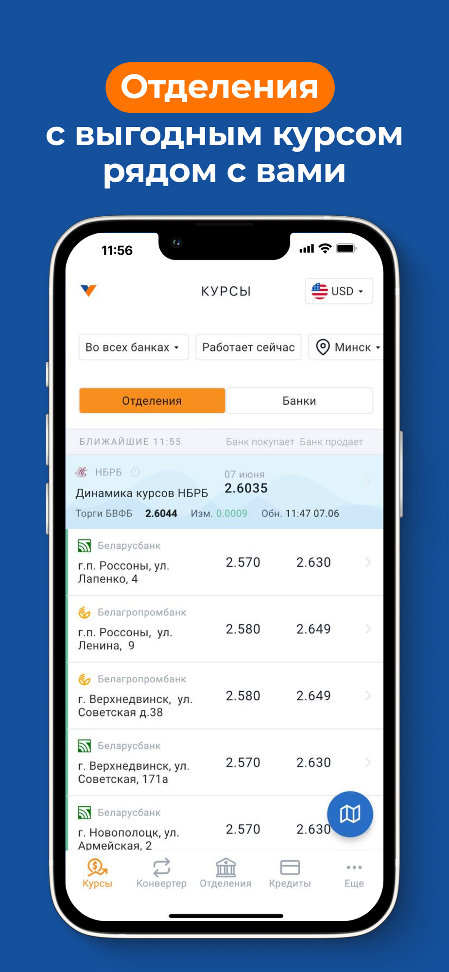 В приложении для каждого отделения вы найдете все услуги, актуальные телефоны, курсы валют, кросс-курсы и конвертер валют.