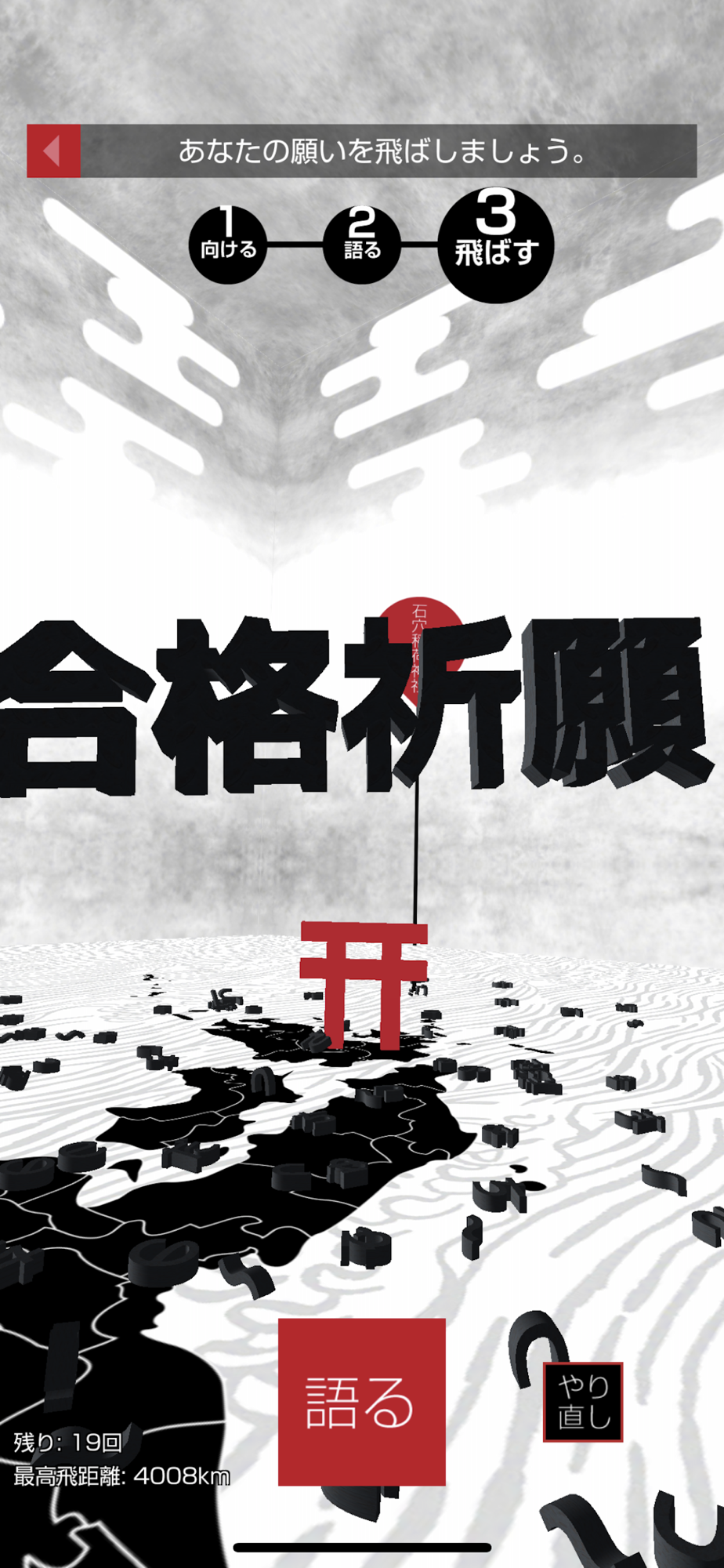 スマホに向かって唱えた願いが、3D の「ひとことだま」に変換されたら、 石穴神社の方向に向かって、フリック!