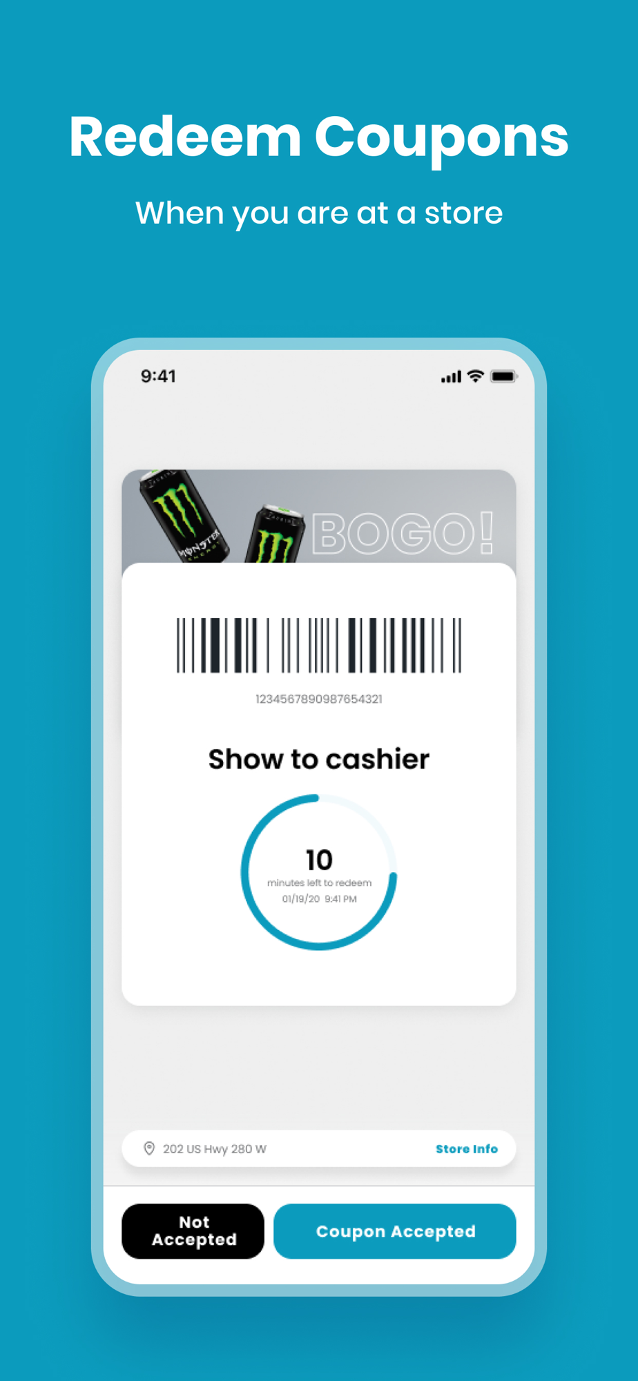 Simply tap the orange redeem button and show your phone at purchase to redeem your coupons.