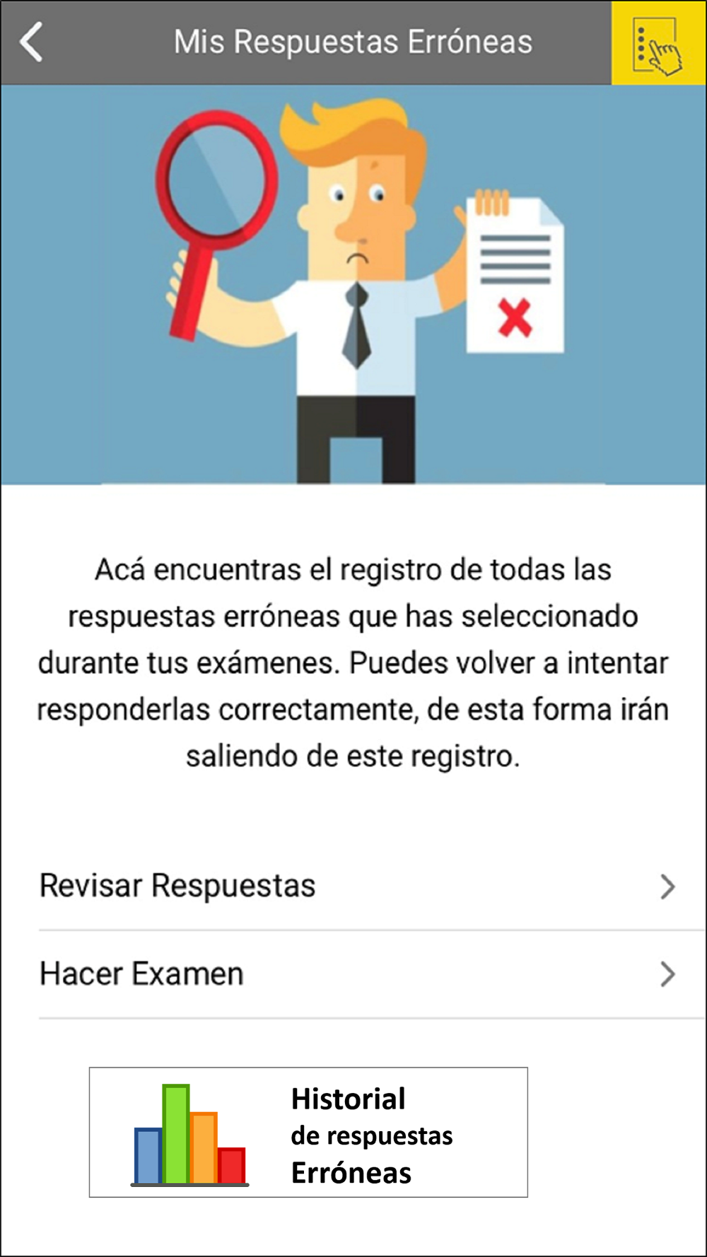 4.- HISTORIAL DE RESPUESTAS: Permite revisar el archivo personal de todas las preguntas buenas y malas, así cada usuario podrá saber en cuál tema debe reforzar su aprendizaje.