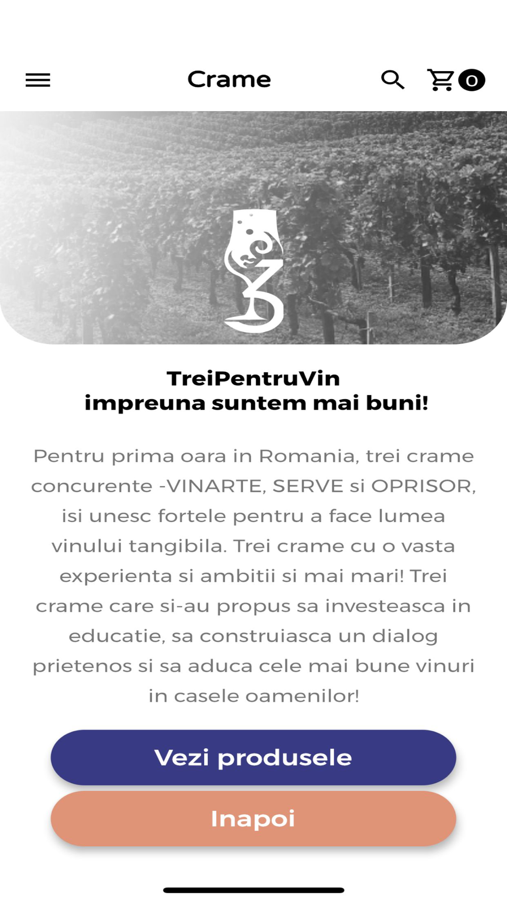 Pentru prima oara in Romania, trei crame concurente -VINARTE, SERVE si OPRISOR, isi unesc fortele pentru a face lumea vinului tangibila. Trei crame cu o vasta experienta si ambitii si mai mari! Trei crame care si-au propus sa investeasca in educatie, sa construiasca un dialog prietenos si sa aduca cele mai bune vinuri in casele oamenilor!
