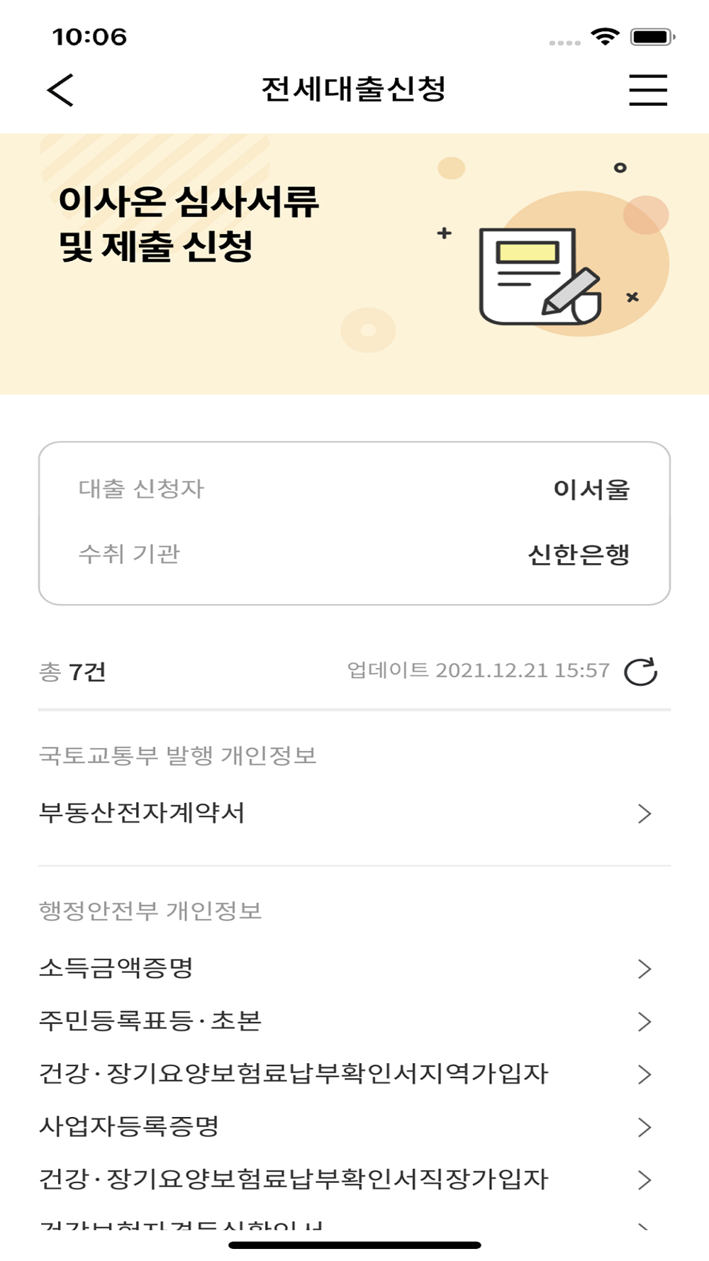 - 신한은행과 연계하여 전세자금 대출 시 필요한 서류을 마이데이터 제출로 대체할 수 있습니다.