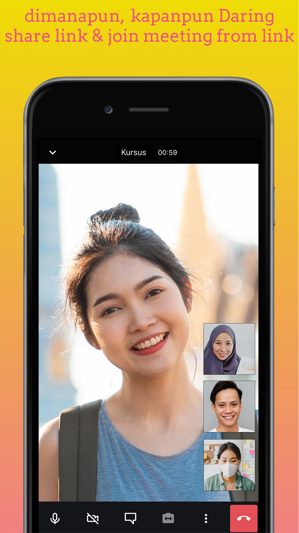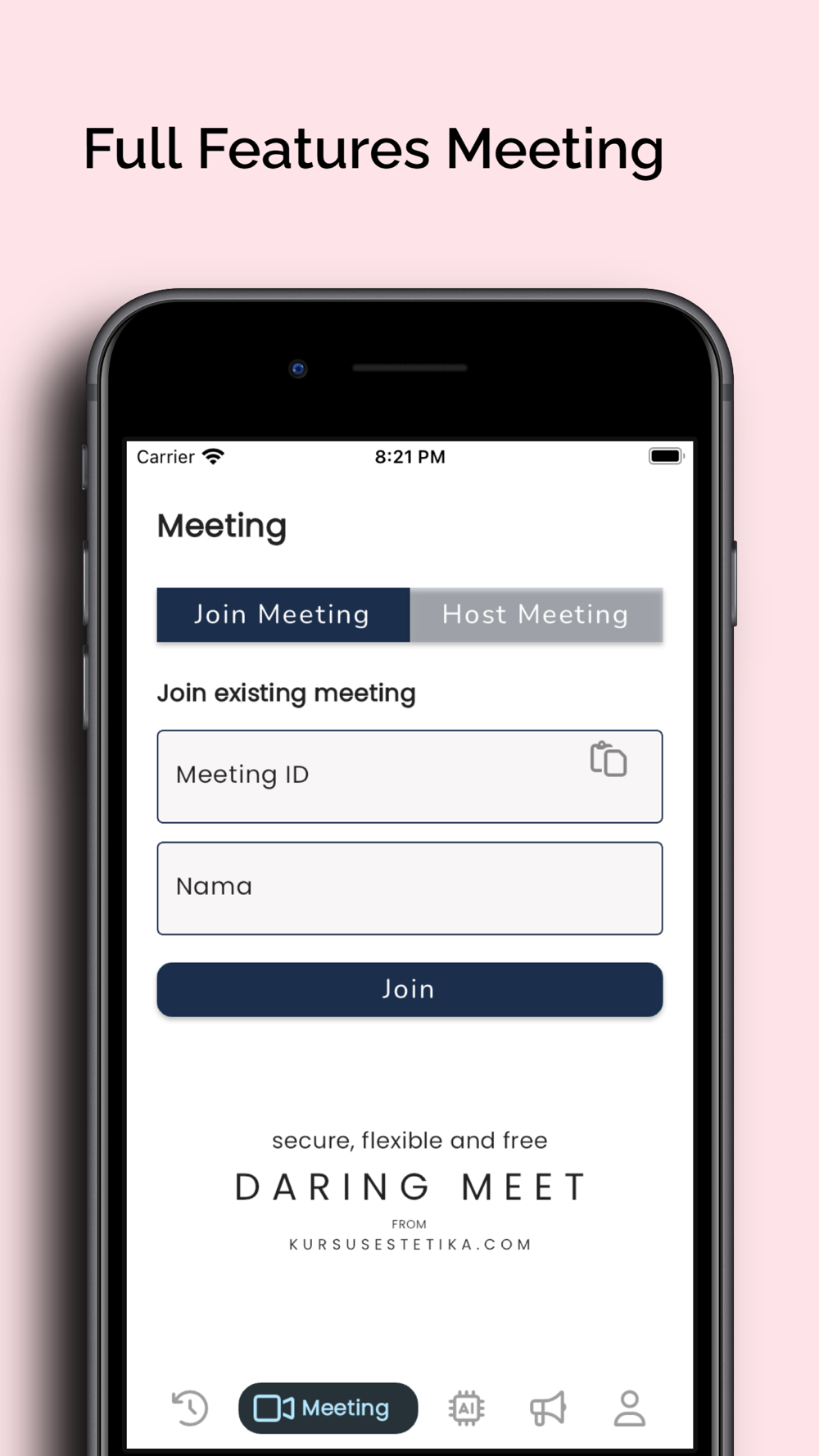 DARING MEET. Aplikasi video conference untuk online meeting bagi semua orang yang mudah, aman dan fleksible. Dapat digunakan untuk kursus, pendidikan, seminar, kelas, workshop, telemedicine, telehealth dan sebagainya secara daring.