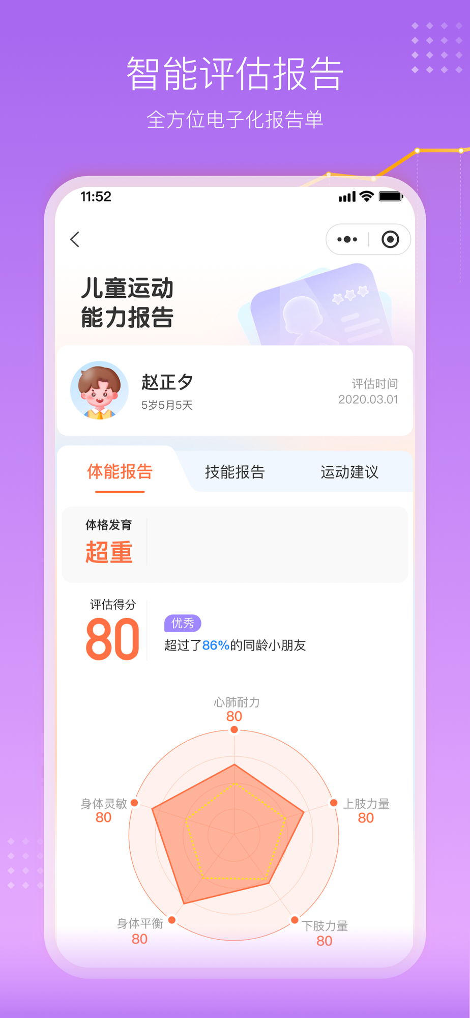 3-6岁,孩子的每一个细微发展都值得被关注。朵步宝贝根据宝宝的月龄,在柔韧、平衡、灵敏、肌肉力量、心肺耐力六大领域,逐项匹配相应的评测视频,老师根据专业的测评设备,观察判断孩子各项指标,得到评测结果,科学陪伴孩子成长。