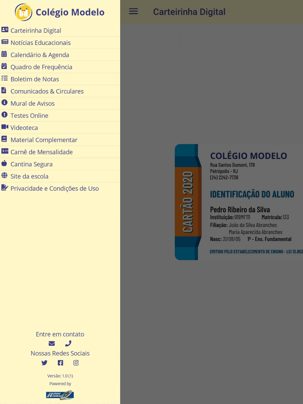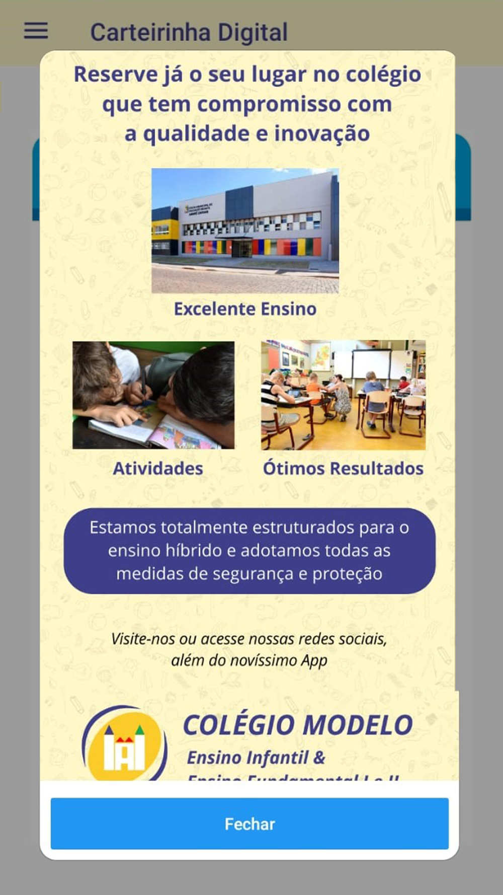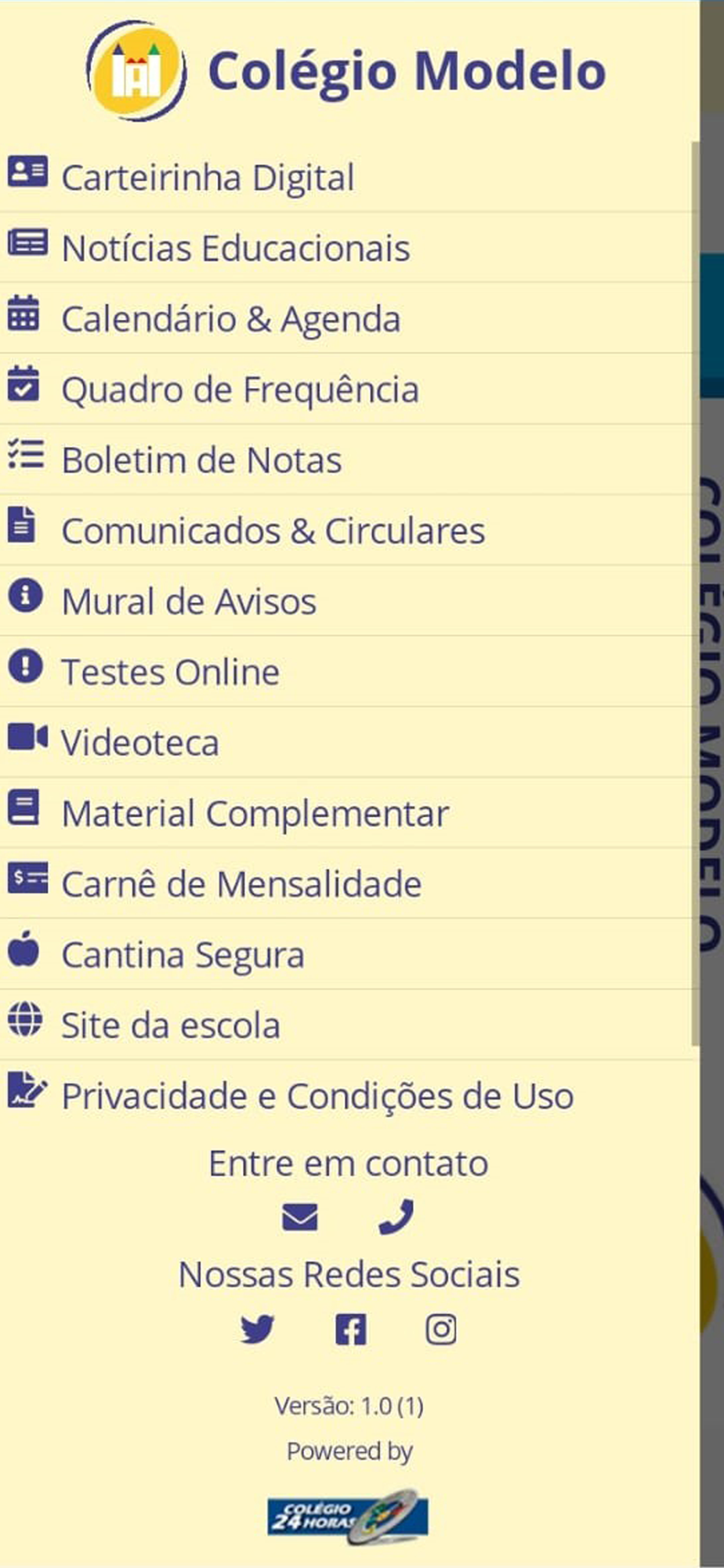 Este é o aplicativo do COLÉGIO MODELO que é mantido pelo Colégio 24 Horas e que proporciona uma série de serviços e funcionalidades para os alunos e para a comunidade escolar.