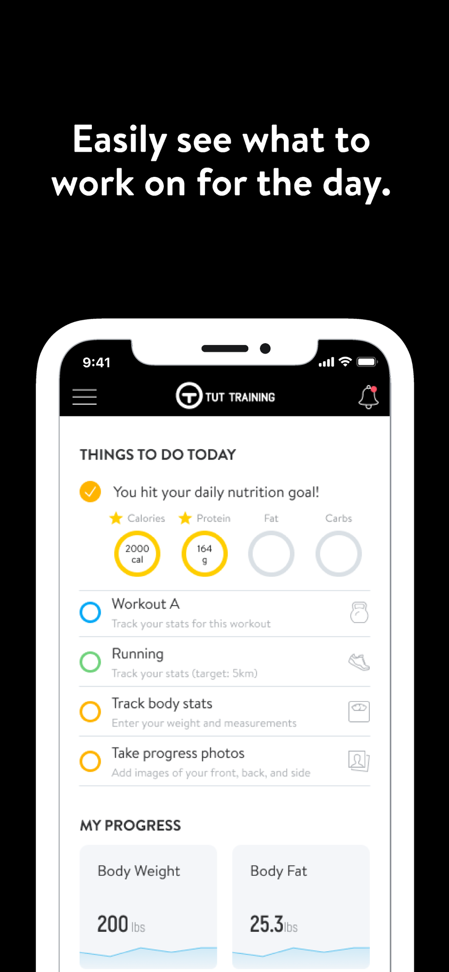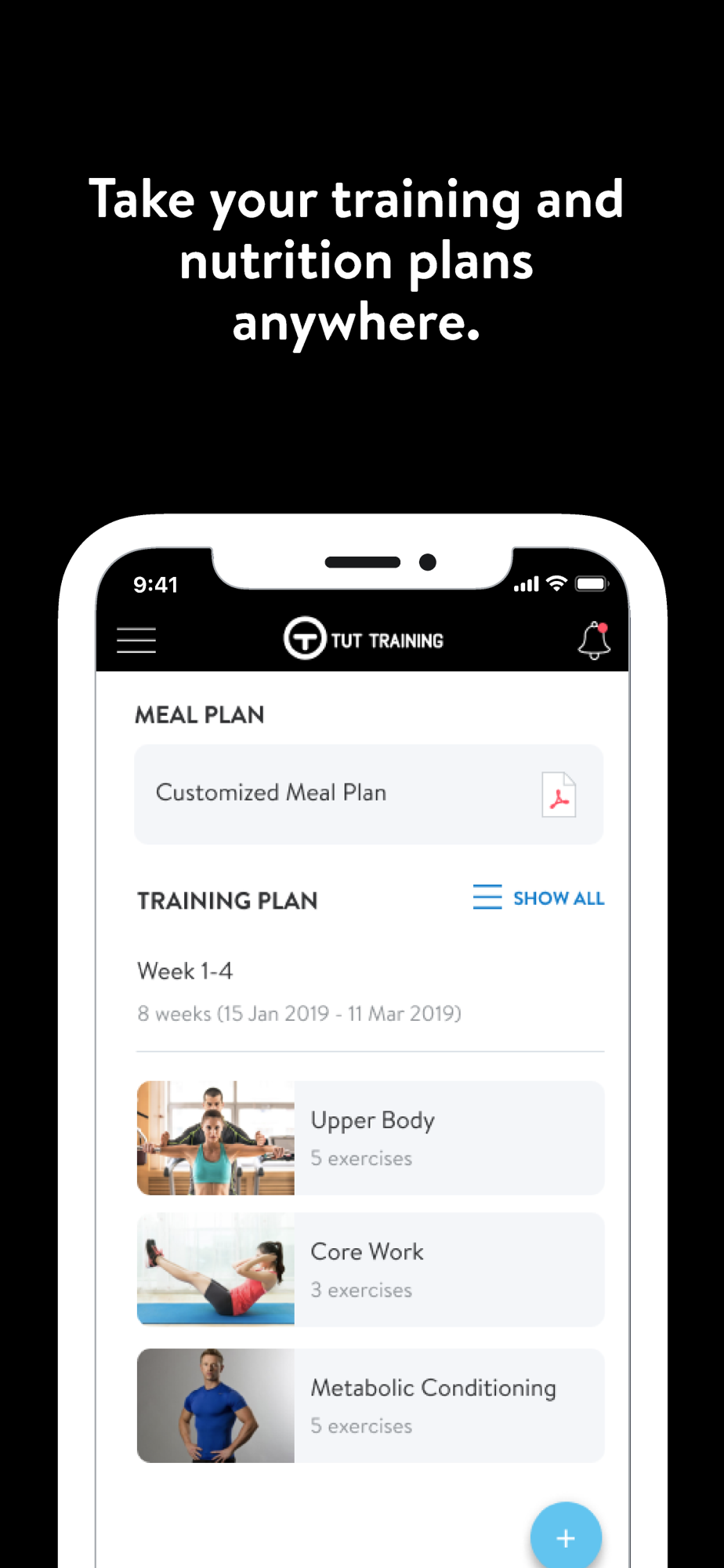 With the TUT Training App, you can start tracking your workouts and meals, measuring results, and achieving your fitness goals, all with the help of your personal trainer.