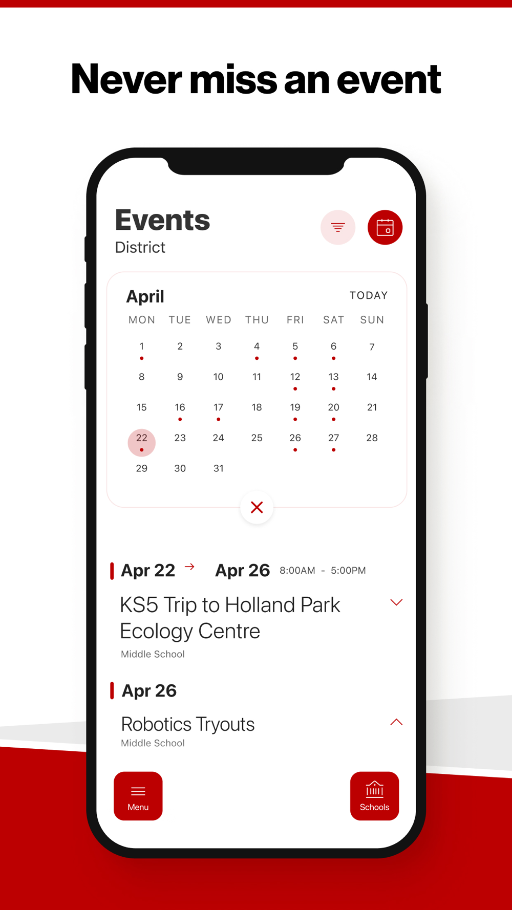 The event section shows a list of events throughout the district. Users can add an event to your calendar to share the event with friends and family with one tap.