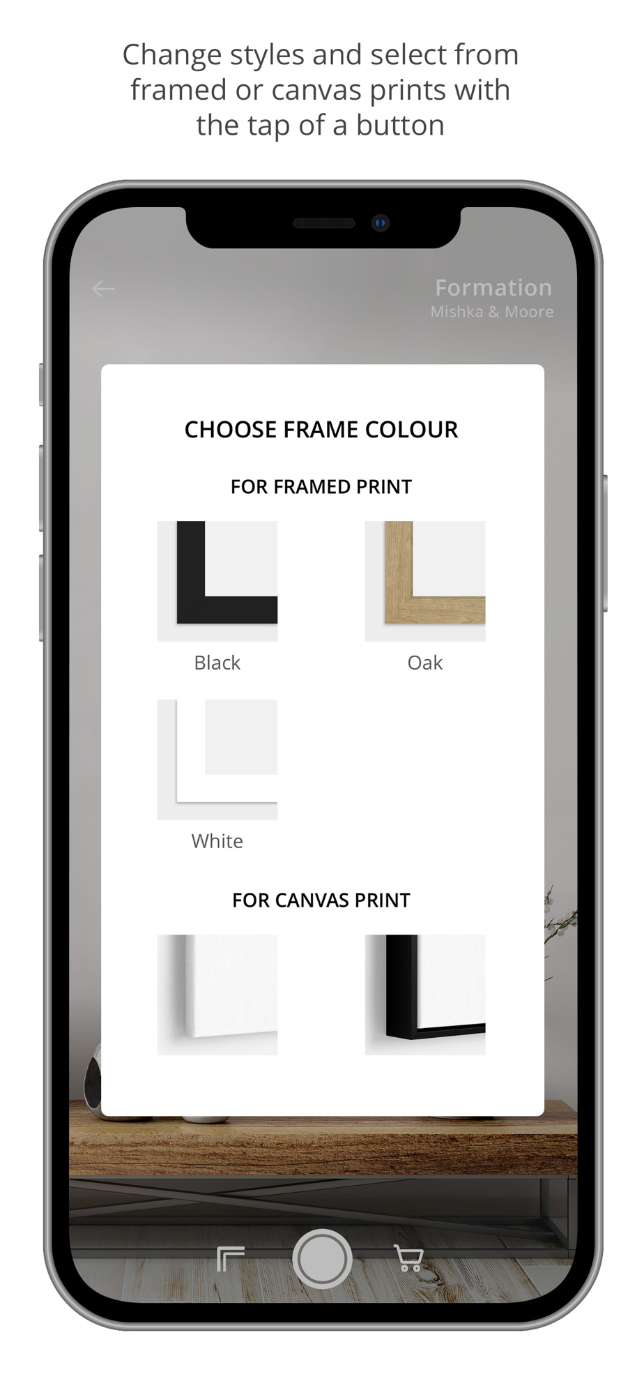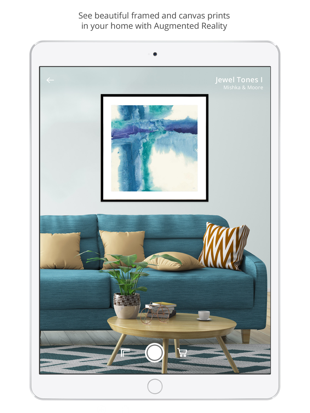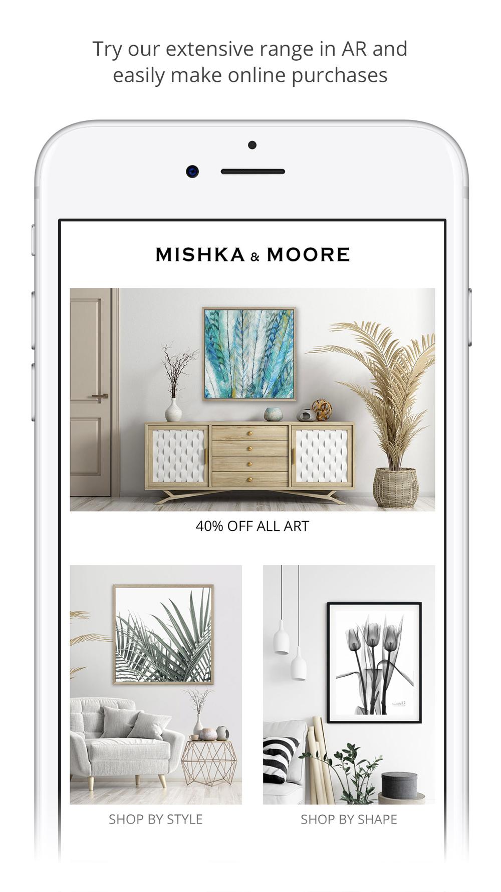 Mishka & Moore now make it possible to view a huge range of gorgeous, quality art on your own wall in your own home. Using the latest technology we have created a 3D Augmented Reality (AR) App that enables you to preview a piece of art to see how it looks hanging on your wall, in your environment, together with your décor. So now, from the luxury of your own home, you can choose, resize, try different frame colour options, before seamlessly clicking through to the website to purchase the item.
