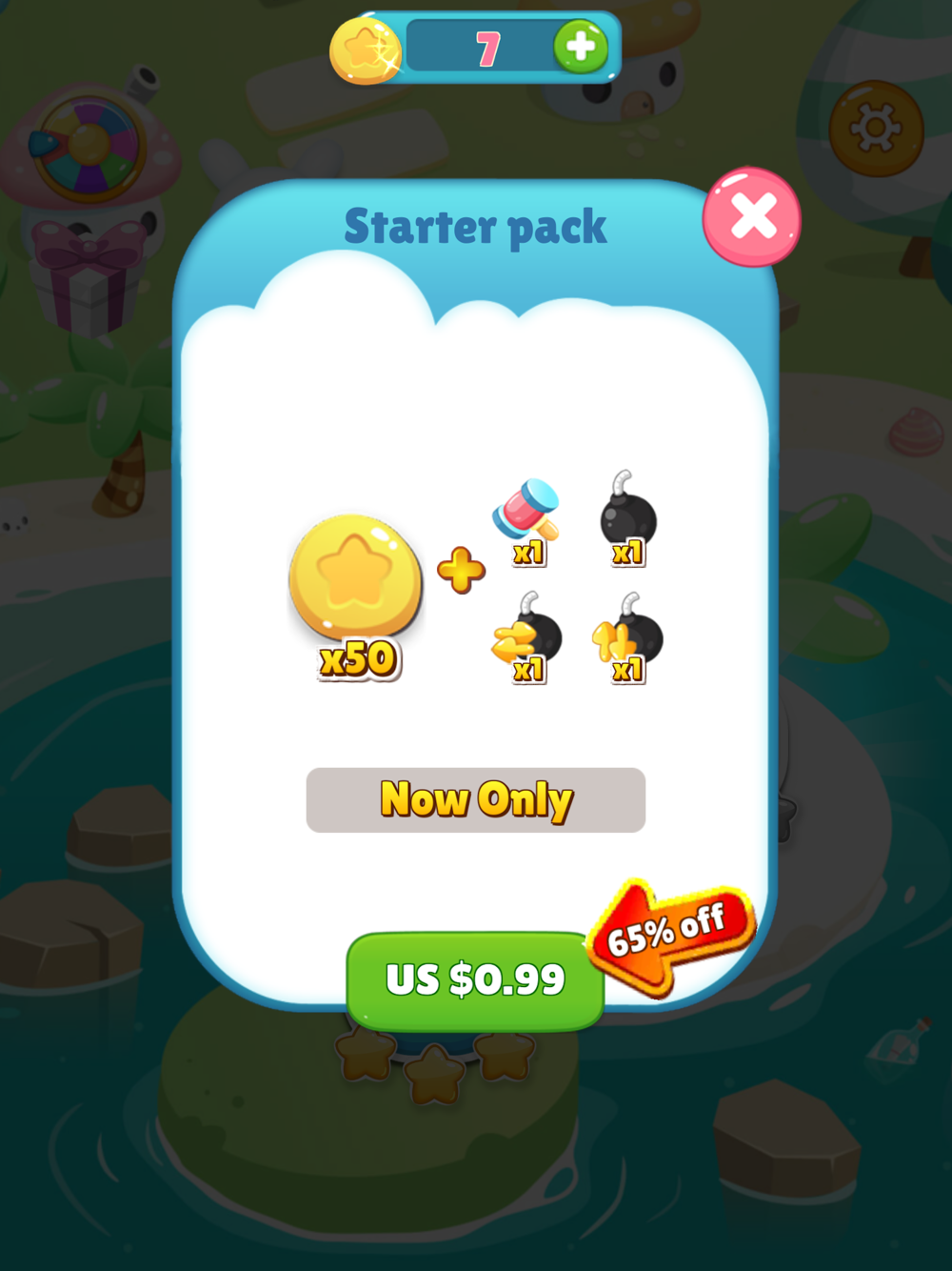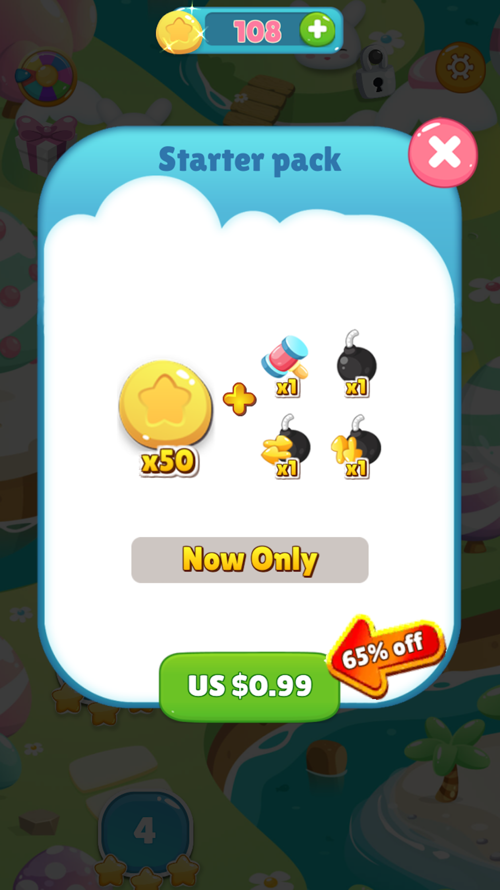 Match 3 or more Candies with the same color in this sweety puzzle adventure! Collect bomb,booster etc items to help you pass the level more easily.