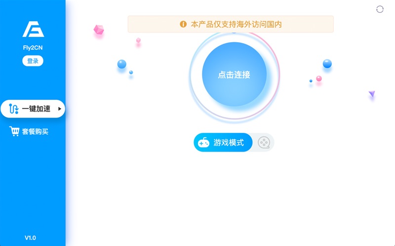 Fly2CN加速器是一款针对海外华人的加速器。使用高速专线,一键加速,帮助全球各地华人用户看视频、听音乐、玩游戏不再卡顿。
