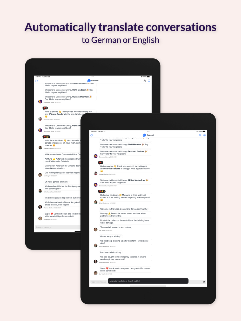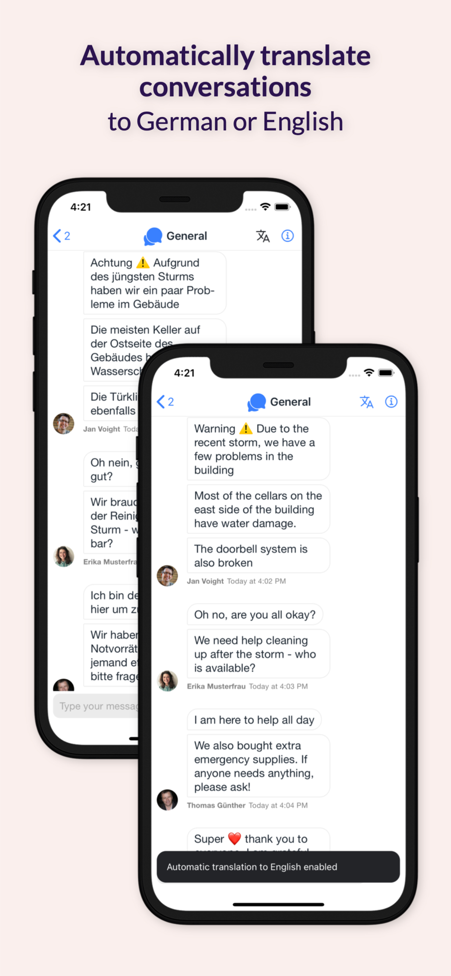 - Automatically translate messages into your preferred language (German or English)