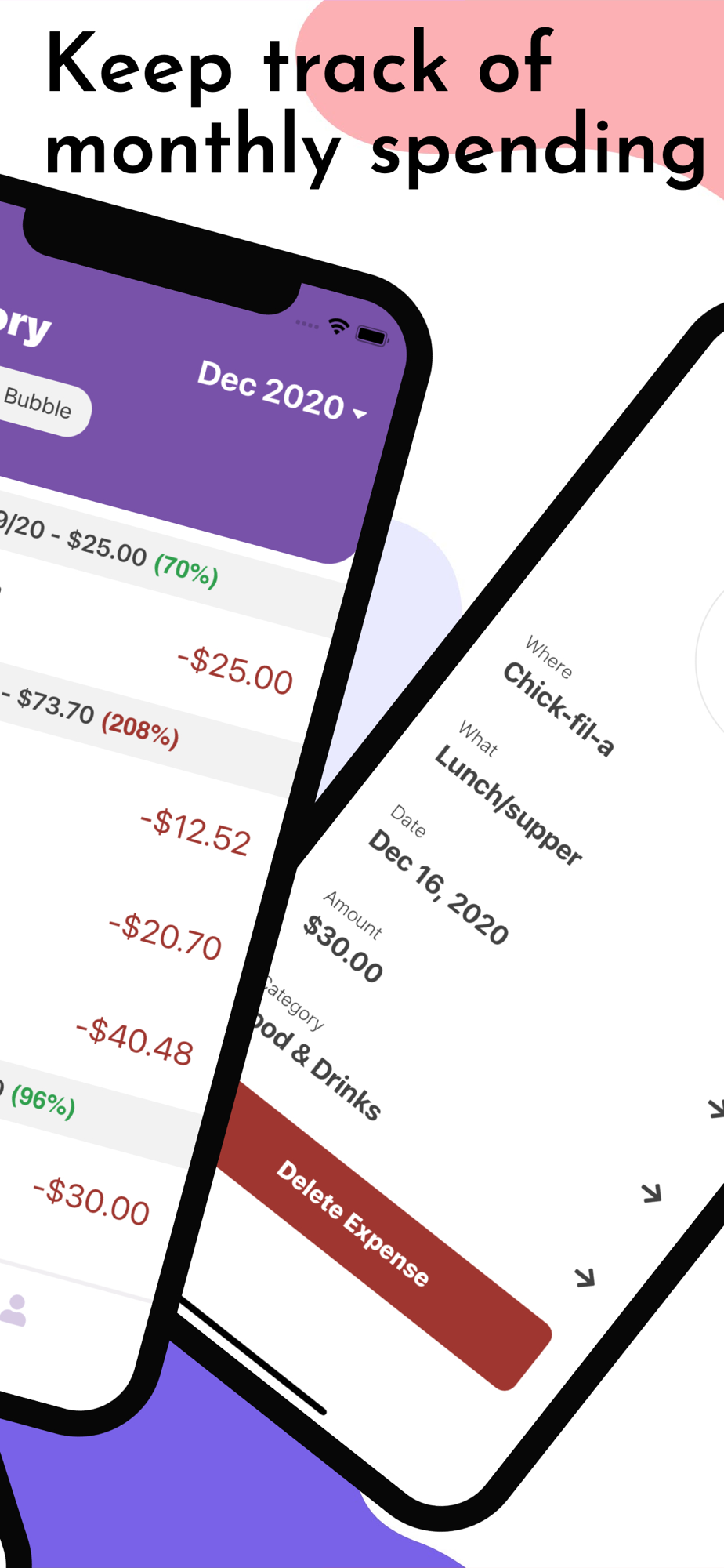 Everyone needs a budget, and while there are many in-depth budget tracking apps out there, most require you to link your bank accounts and credit cards. With Bdgt we wanted to make a simple way to track your spending without opening you up to the vulnerabilities of sharing such crucial information. Logging your expenses is a breeze and can be done in mere seconds. It feels great to look back on previous months where you went way below your spending goals, and is incredibly valuable to look back on the months where you did not do so great. Start tracking and get your finances in check with Bdgt today!