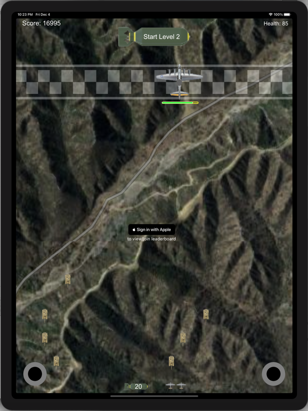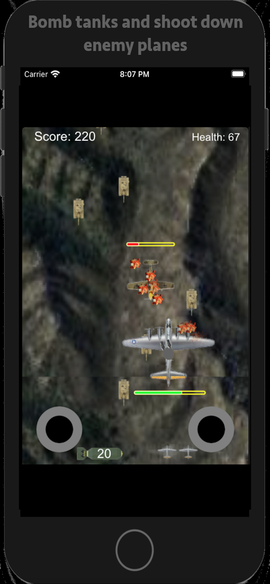 Classic style arcade action game, World War II B-17 bomber. Drop bombs on enemy tanks and shoot down enemy planes. Use left joystick to maneuver plan and right joystick to rotate gun turret and shoot enemy planes. Click anywhere on screen to drop bombs on enemy tanks. Optionally, login to view and participate in online community leader board.