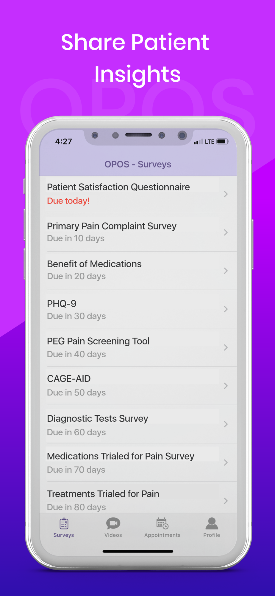 With OPOS Foresight you can share your insights, experiences and feelings through surveys that have been selected by your physician to monitor your health and wellbeing. You will receive new surveys periodically on a weekly, monthly, bi-monthly or annual basis. Only your physician has access to the information you provide.