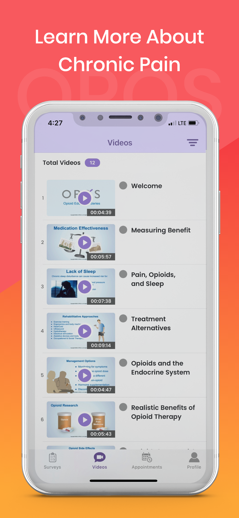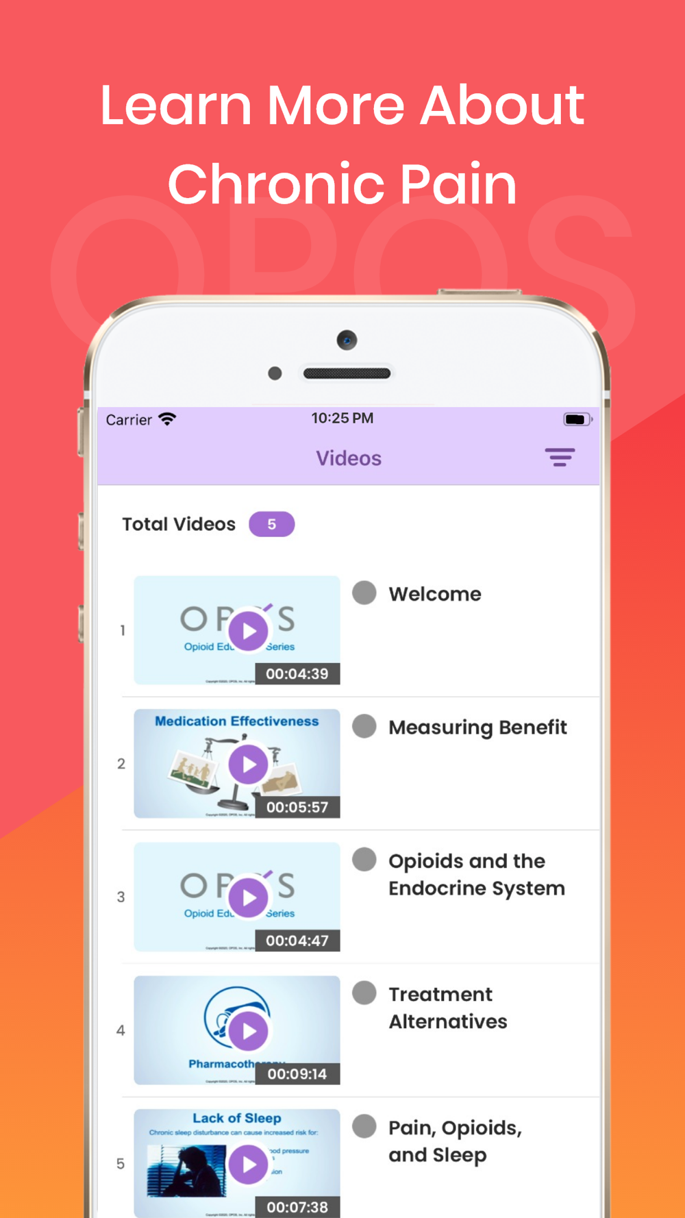 OPOS Foresight videos are designed to educate you about chronic pain and treatment options. You will have access to education about the role of opioids in a long-term treatment plan as well as information about non-opioid treatments. Your prescribing provider selects the educational content to reflect their treatment beliefs and to ensure your guideline requirements are met.