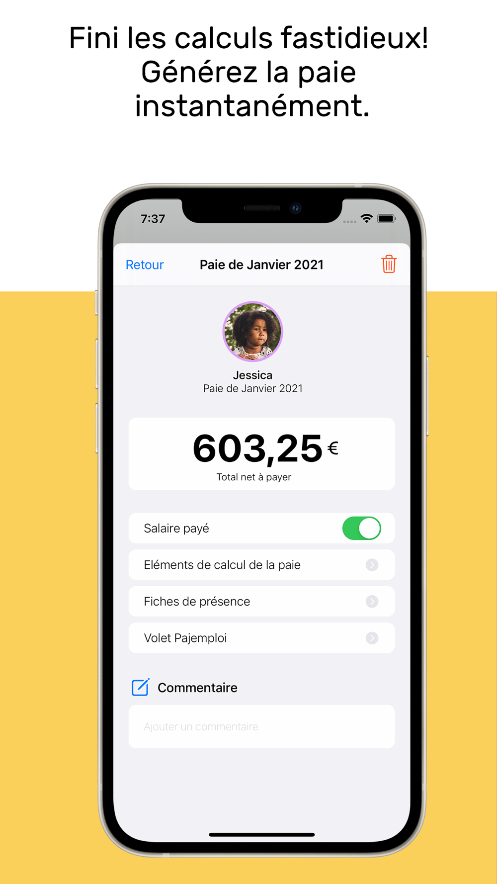 Maintenant que les fiches de présences sont saisies, ne perdez plus votre temps a effectuer des calculs de tête ! Renseignez les fiches manquantes, décomptez ou pas les congés payés, puis générez la paie du mois. Facile ! De plus, le volet PAJEMPLOI vous aide à saisir la déclaration en ligne