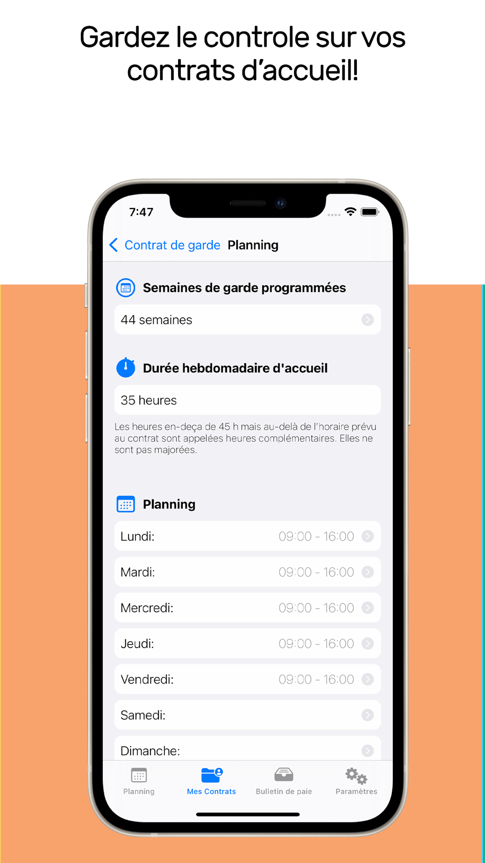 L’assistant d’ajout de contrat vous guide dans la saisie des informations d’un nouveau contrat d’accueil. Il vous aide à concevoir un planning d’accueil hebdomadaire, à saisir les informations contractuelles puis calcule le salaire mensualisé. Planning variable d’une semaine à l’autre ? Vous pouvez saisir des accueils comme bon vous semble.