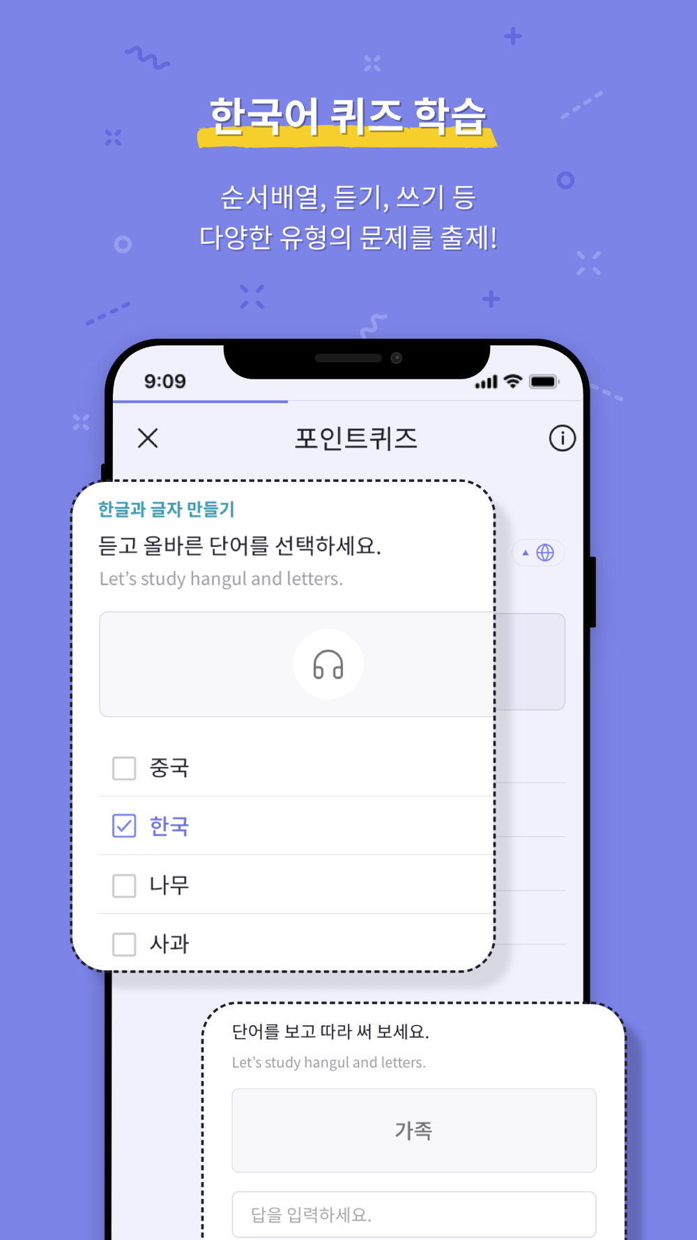 단어 순서 배열, 쓰기, 듣기 등 다양한 유형의 문제가 출제되어 학습 내용을 복습할 수 있습니다.