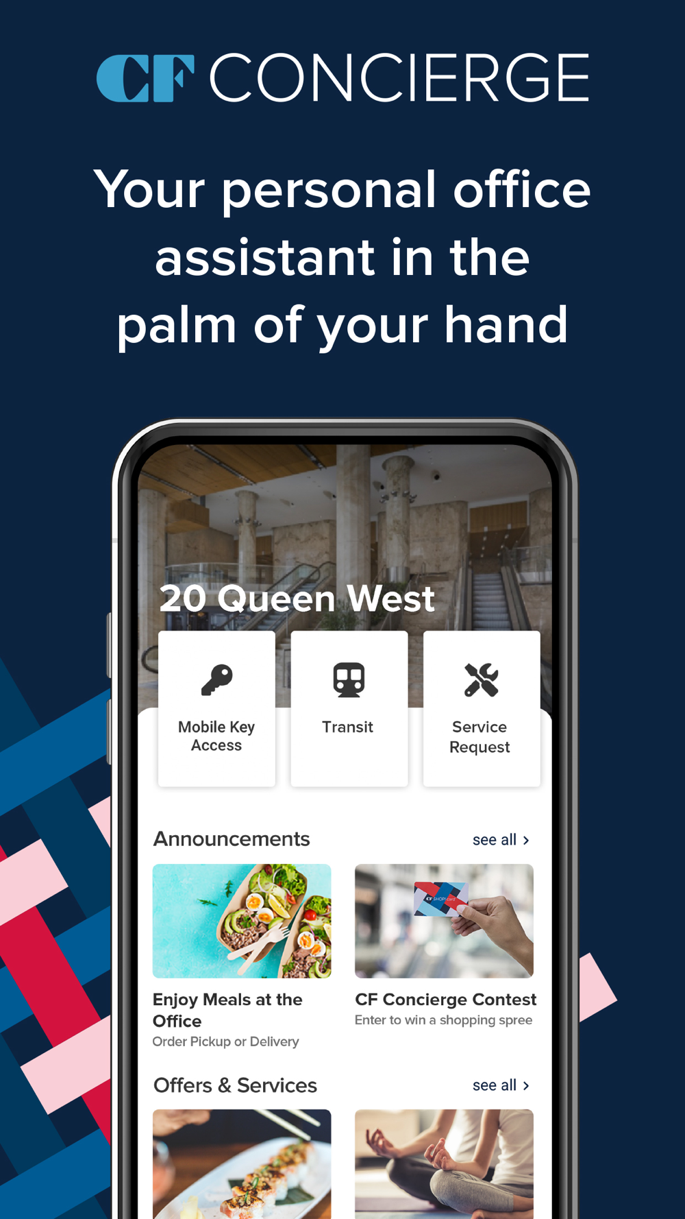 CF Concierge is a convenient and intuitive mobile app designed for occupants of participating CF offices to enhance and compliment your work day. Whether you're at the office or working remotely, CF Concierge serves to help you cultivate a workplace environment that fosters engagement, productivity, & well-being.