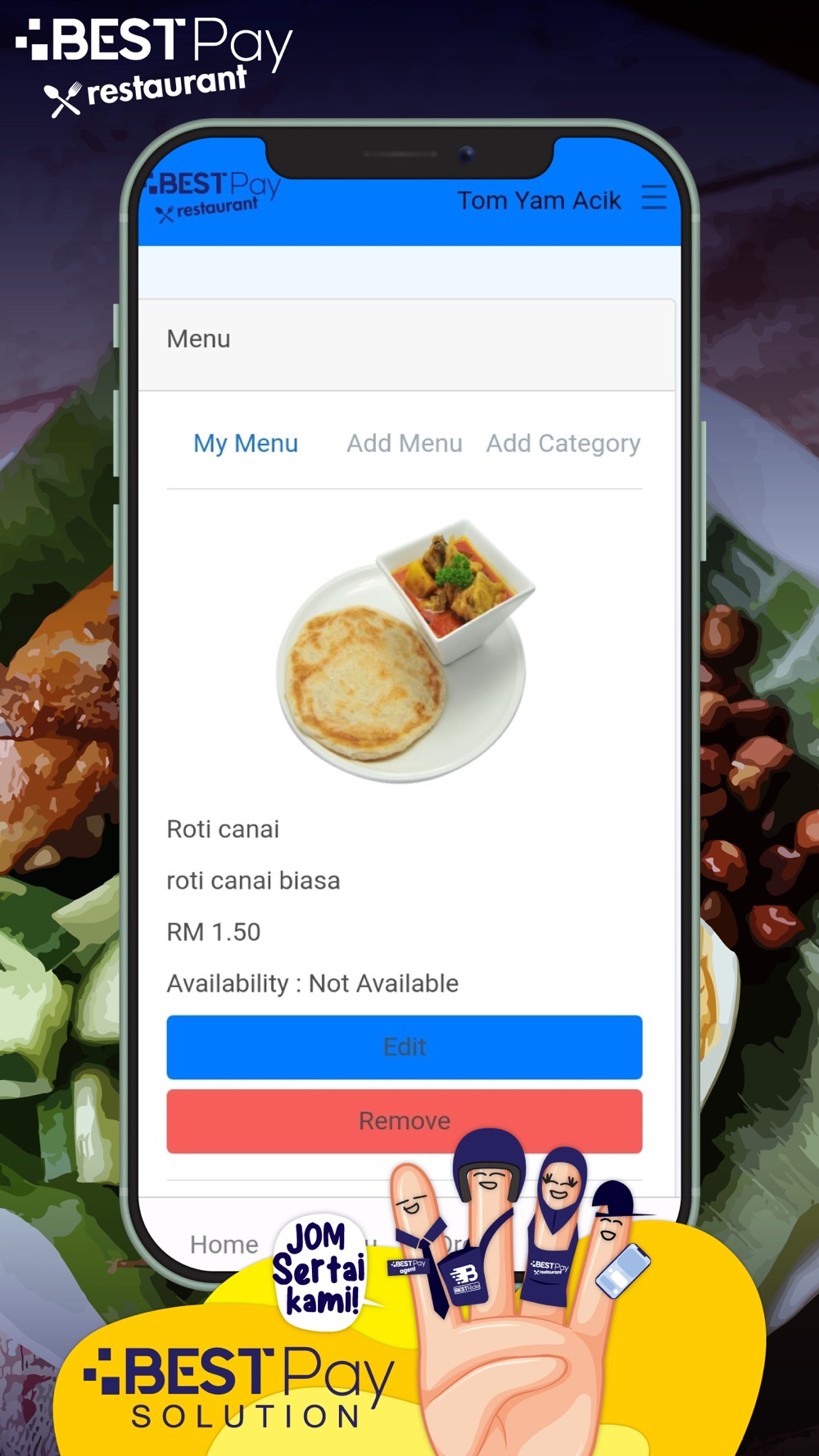 This apps is for BESTPay Merchant Partner only. Use to manage their sales, and settlement report. Additionally, this apps also help BESTpay Merchant Partner to increase sales by adding more menu into the platform. For those who interested be our BESTPay Merchant Partner, please register at best-pay.com.my/merchant/restaurant