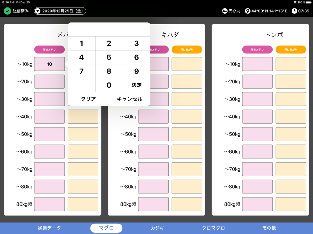 延縄日誌は「まぐろはえ縄漁業」におけるスマート化を推進するためのiPadアプリケーションです。操業情報に加えて魚種別、サイズ別の船内ストックである漁獲情報を共有することができ、スマート水産業のうち流通改革を支援します。なお、専用の衛星通信ルータを用意する必要があります。