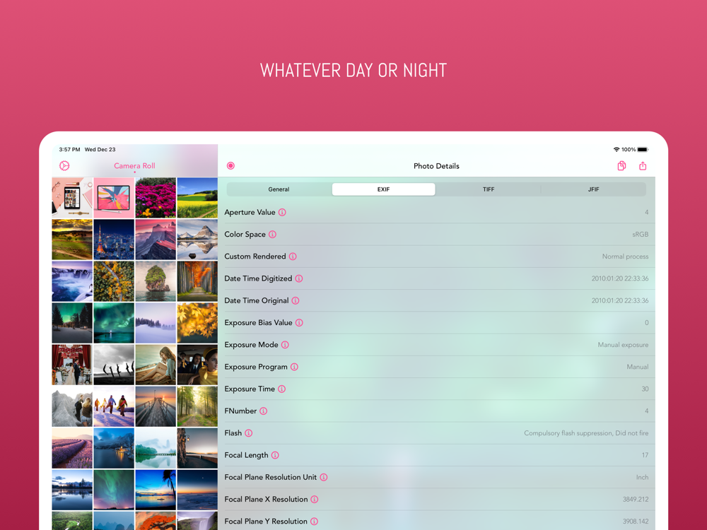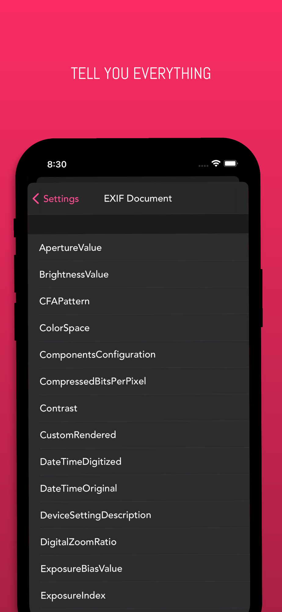 Dr.EXIF is a beautiful app to help you view photo info. EXIF Document inside help you better understand the meaning of EXIF infos.