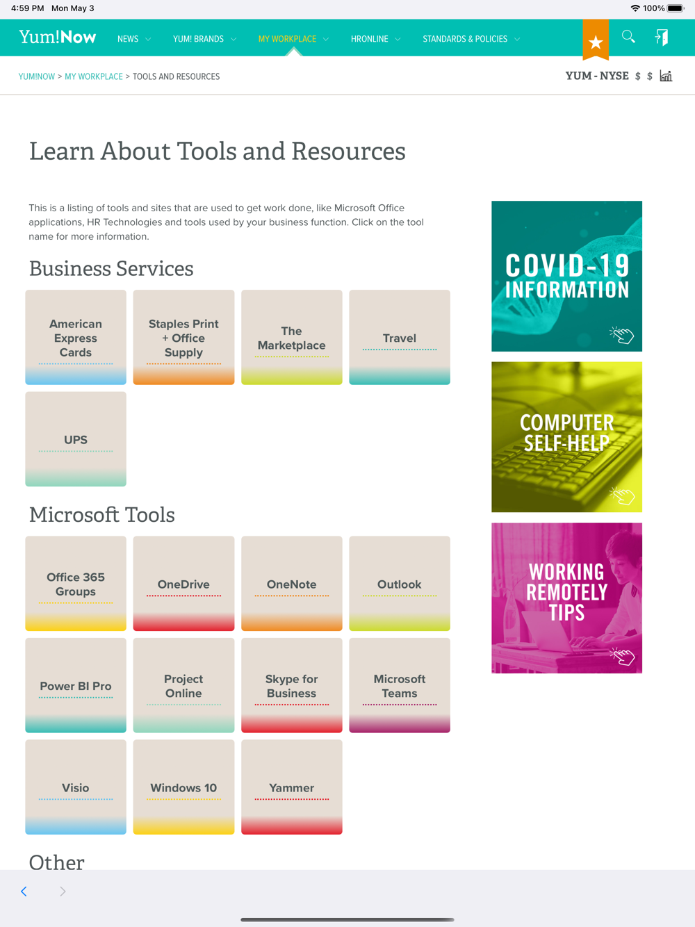 An app for Yum employees to access the Yum Portal. The app maintains the login access using a token, provides tools and resources available for employees only, and push notification for communications.
