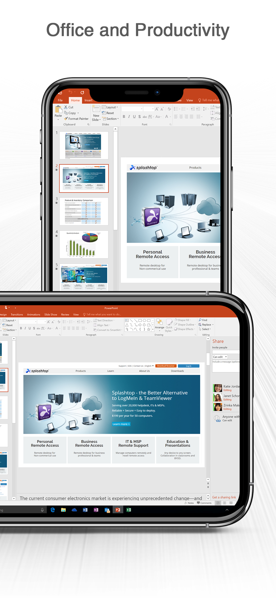 Employees on the go can enjoy all the benefits of remotely accessing applications and data from their BYOD / company-distributed devices as if they were in front of their computers set in offices. Top adoptions include industries using 3D, CAD, CAM, or ones of design, education, government, manufacturing, healthcare; mobile workers who traditionally use RDP / VPN products. With a top performance of streaming and touch screen, employees working with their devices are allowed to easily access and edit their office files, line of business, 3D graphics and customized web applications from homes or on the go; thus enhancing their productivities.