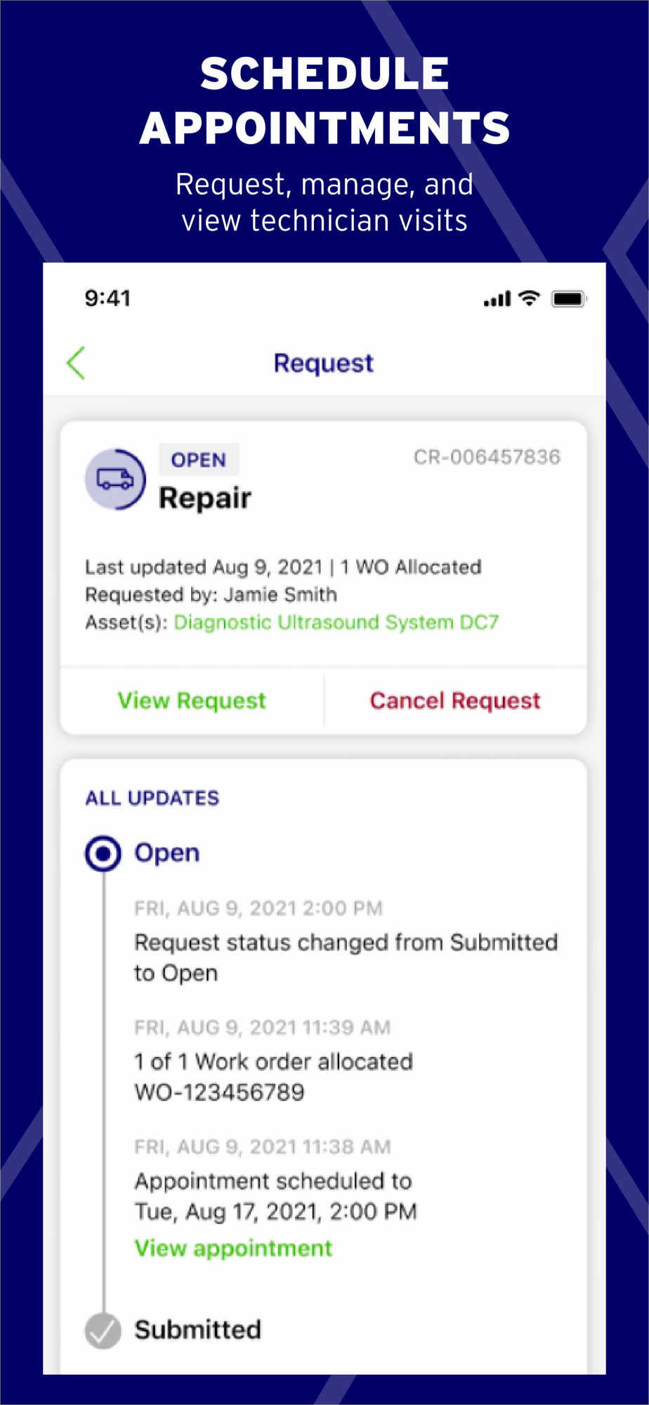 ServiceMax Engage is a turnkey mobile app that connects you with your service organization, technicians, and support agents. With Engage, get greater visibility into your asset data, schedule technician appointments, and interact with remote support directly from within the app.