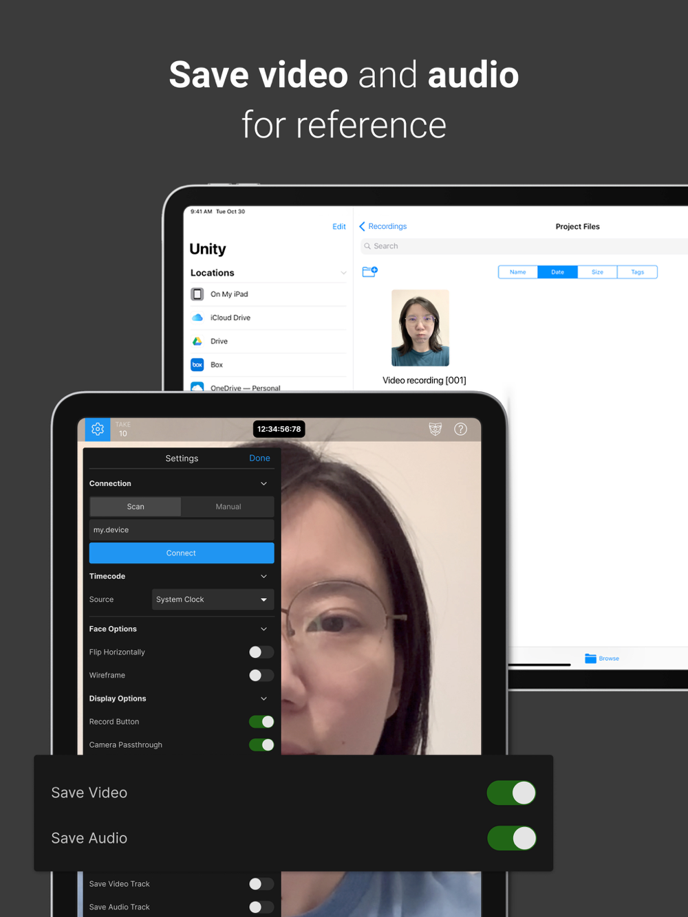 - Synchronize the app data with other connected devices using a centralized timecode source.