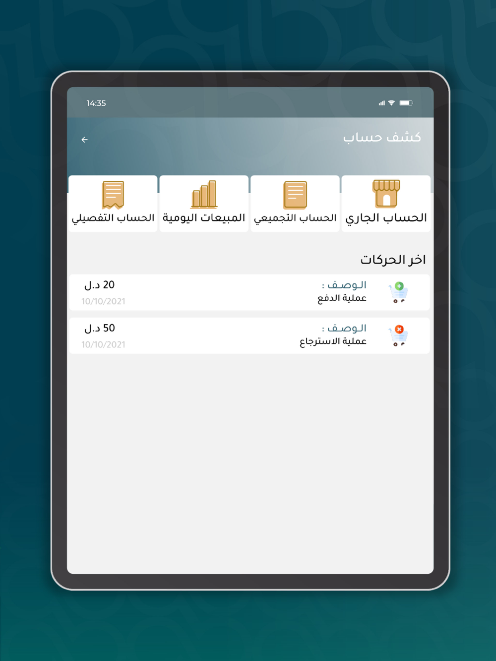 كشف حساب: بإمكان التاجر أو مقدم الاطلاع على كافة فواتيره سواء المدفوعةأو المستردة، الفاتورة تتضمن قيمة البضاعةالمباعة وتاريخ إصدار الفاتورة، وكذلك الاطلاع على رصيد الحساب الحالي، مع إمكانية الحصول على كشف حساب تفصيلي.