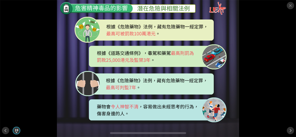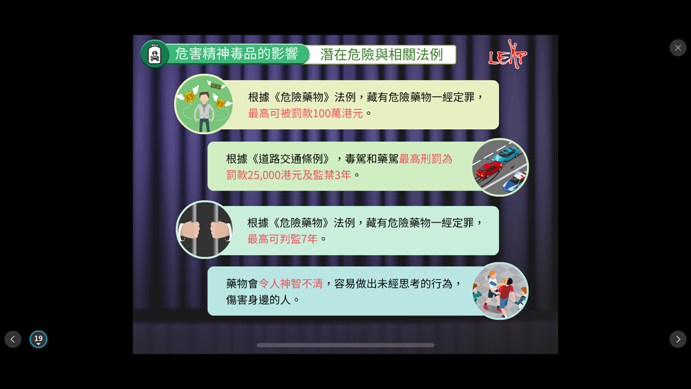 「生活教育活動計劃」(LEAP) 為一所註册慈善機構,致力為中、小學及特殊學校學生提供國際認可的健康及藥物教育課程,以裝備青少年正確的藥物知識及社交溝通技巧,從而預防藥物濫用,協助青少年建立健康、安全和積極的生活模式。因應電子學習的新趨勢,LEAP設計了一系列健康及藥物教育電子書供學生使用。