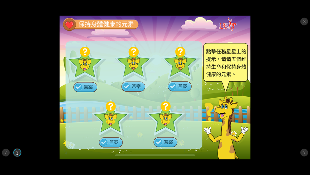 1. 多元互動學習活動:有別於一般網上短片及簡報,LEAP電子書結合有趣的練習和互動電腦遊戲、影像及經驗分享三種學習元素,提升趣味,激發學生學習動機。