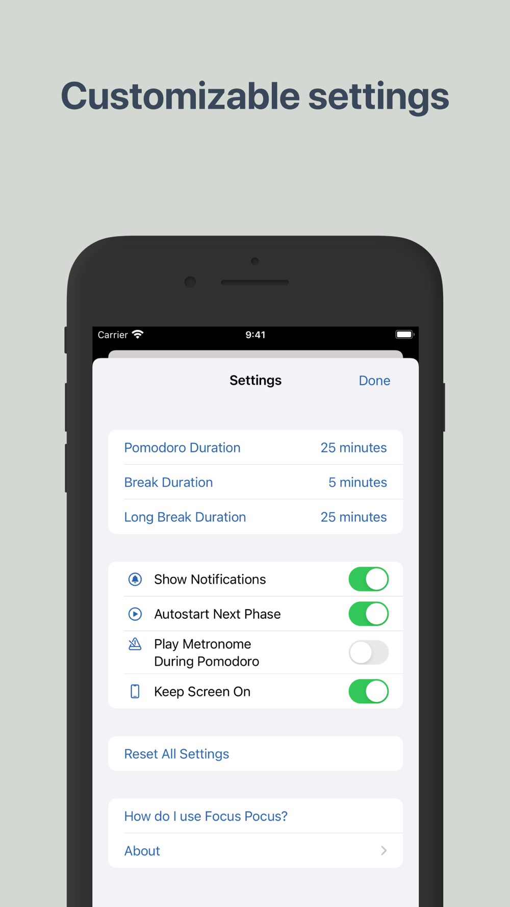 Other pomodoro timer apps may catch your attention with a big countdown timer and flashy colors. Focus Pocus instead opts for a subtle timer design reminiscent of a mechanical wall timer that moves slowly and steadily, with subdued colors that keep the attention on your task at hand. The result is a pomodoro timer that won't distract you while you work.