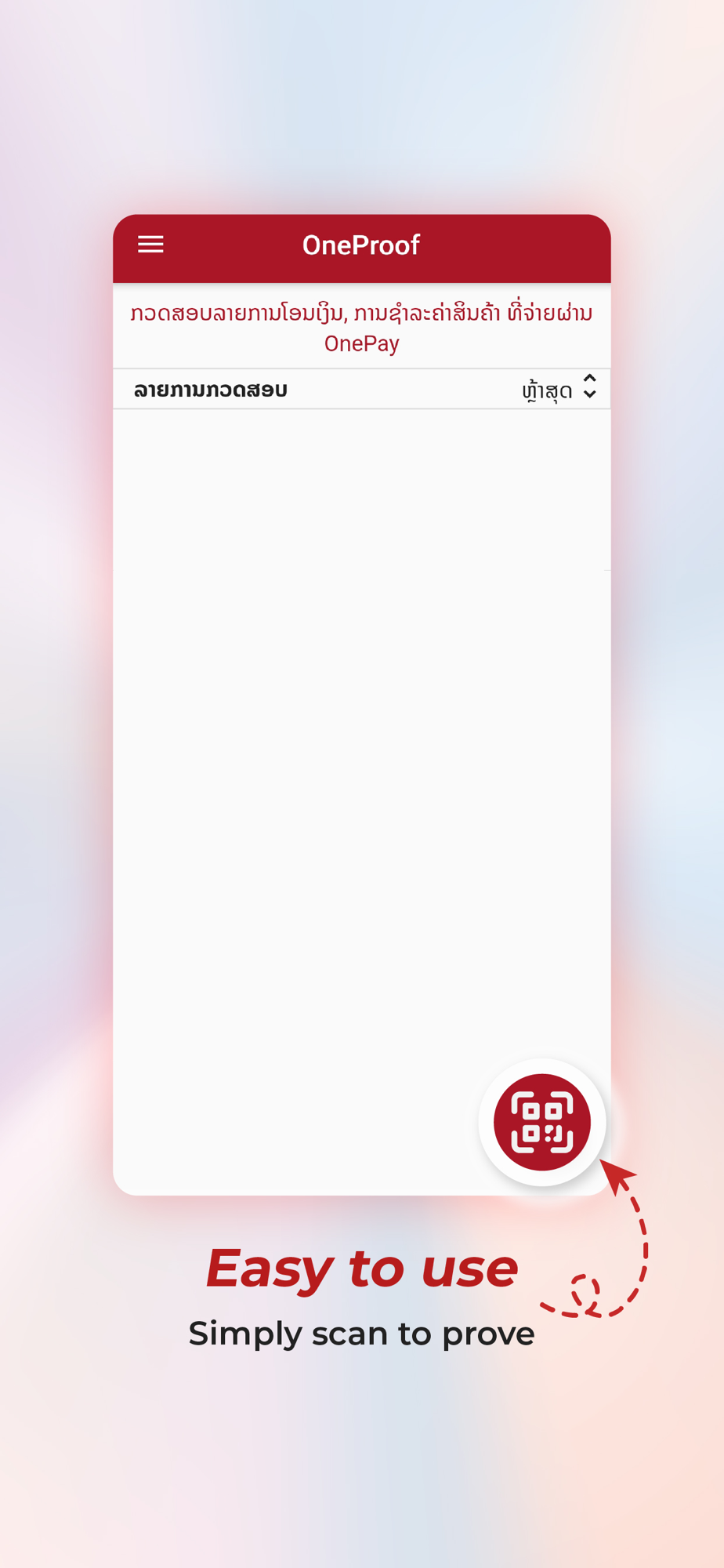 We make it easy for you to prove all payments and documents whether they are valid or not with OneProof. Take your phone up and simply scan the available QR code on BCEL One receipts such as Transfer, OnePay, PromptPay, WeChat Pay, Alipay.