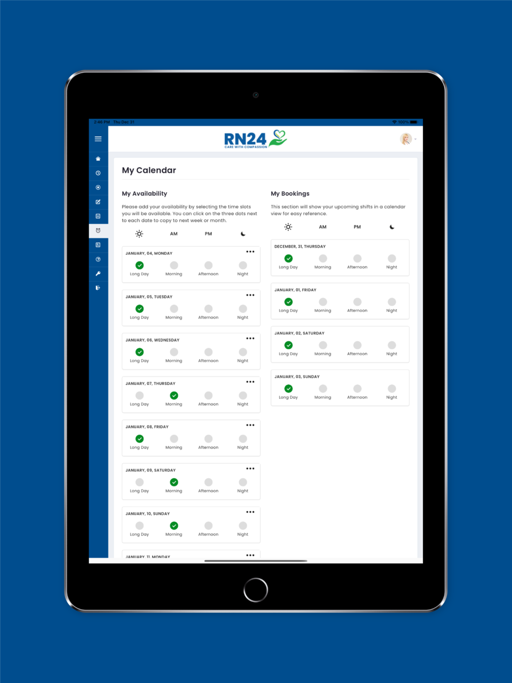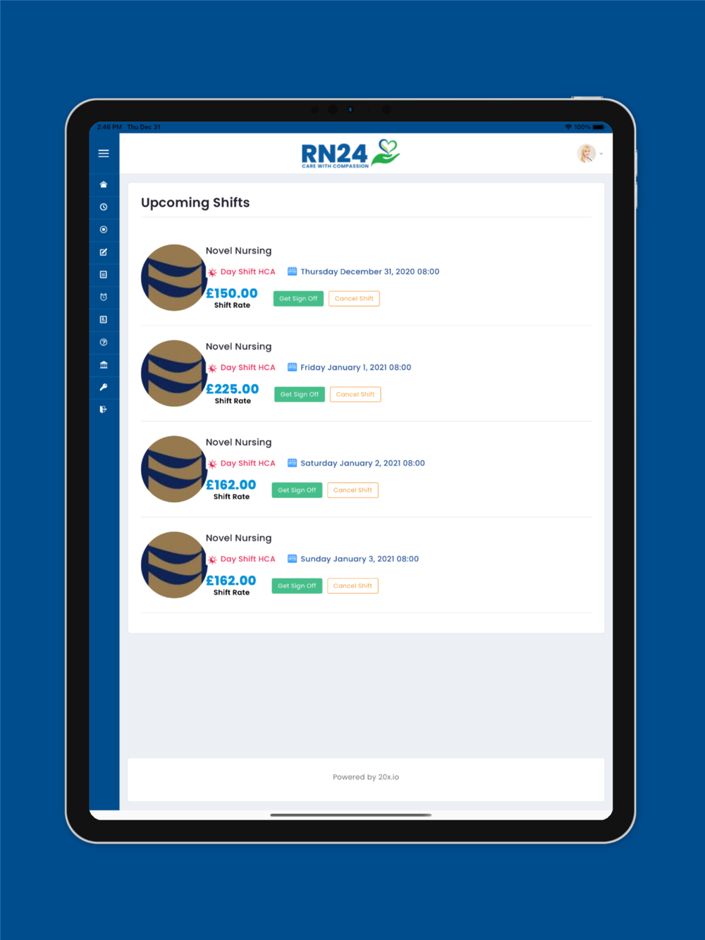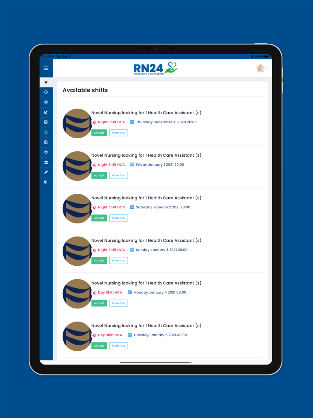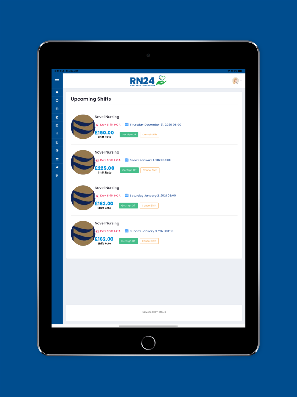 RN24 app helps nurses, carers and other medical staff to create an account, upload their certificates and maintain current fit to practice status. Care homes and hospitals can post shifts through the app for fast and easy notification to the allocated staff to view available vacancies and accept shifts. The app also helps the staff and employers to see their respective work history, payment history, timesheets etc.
