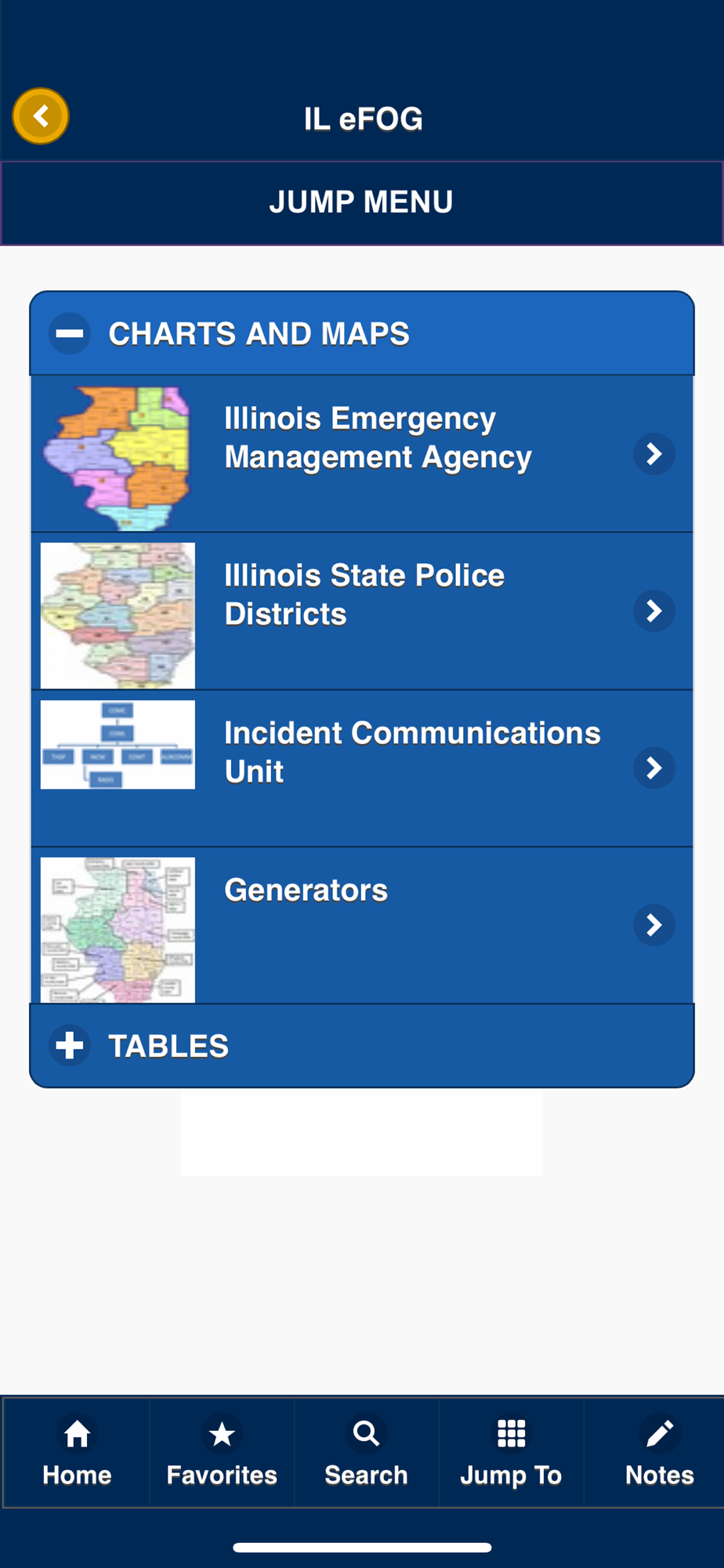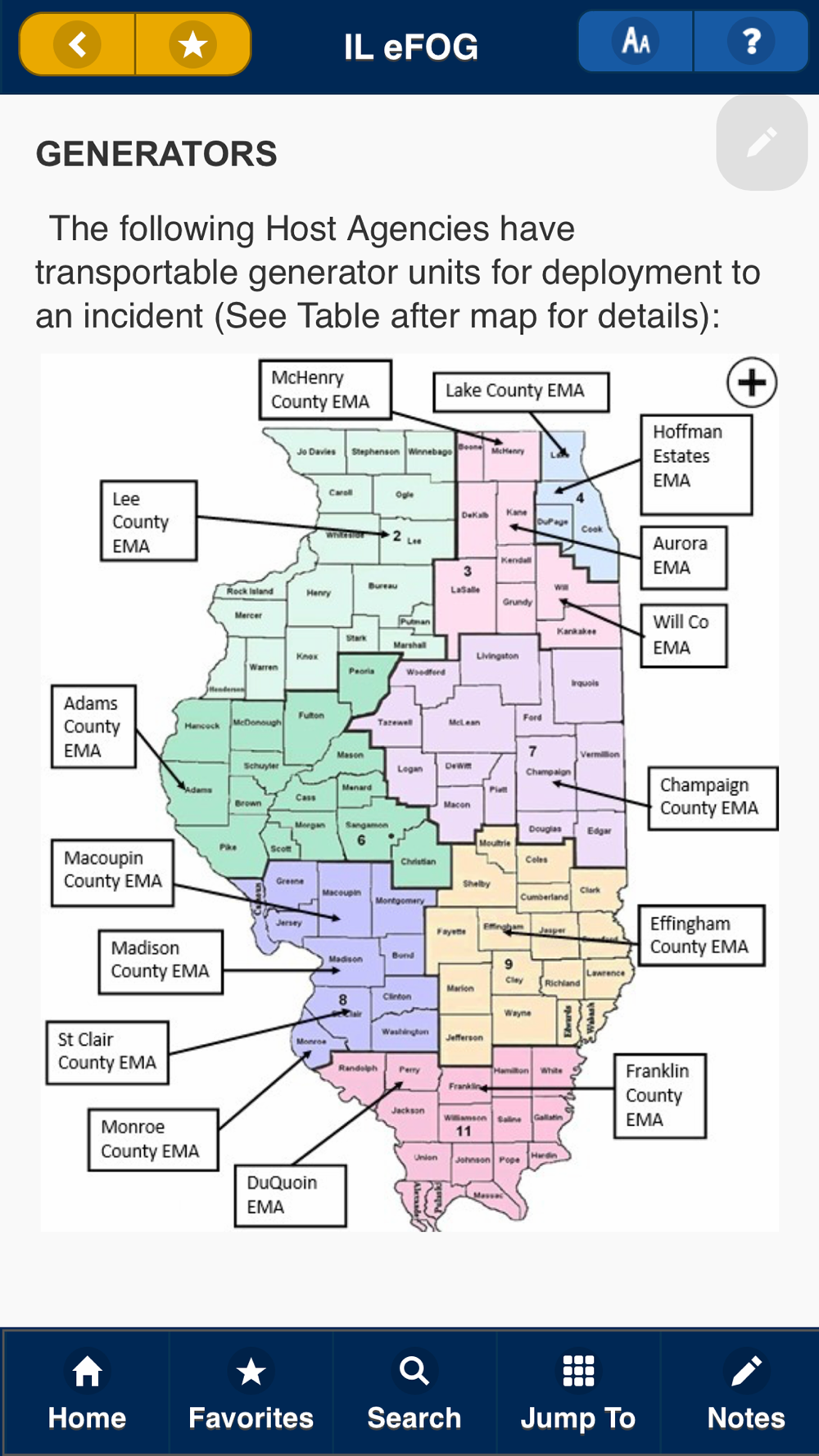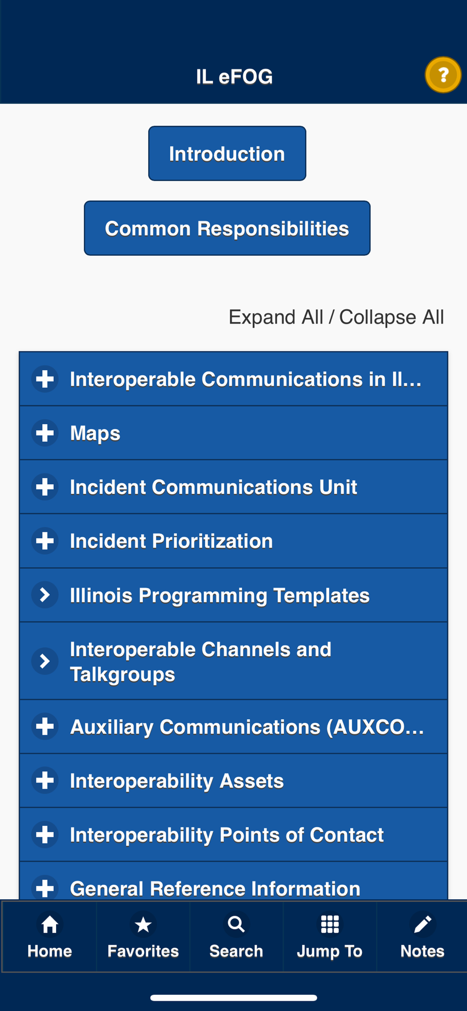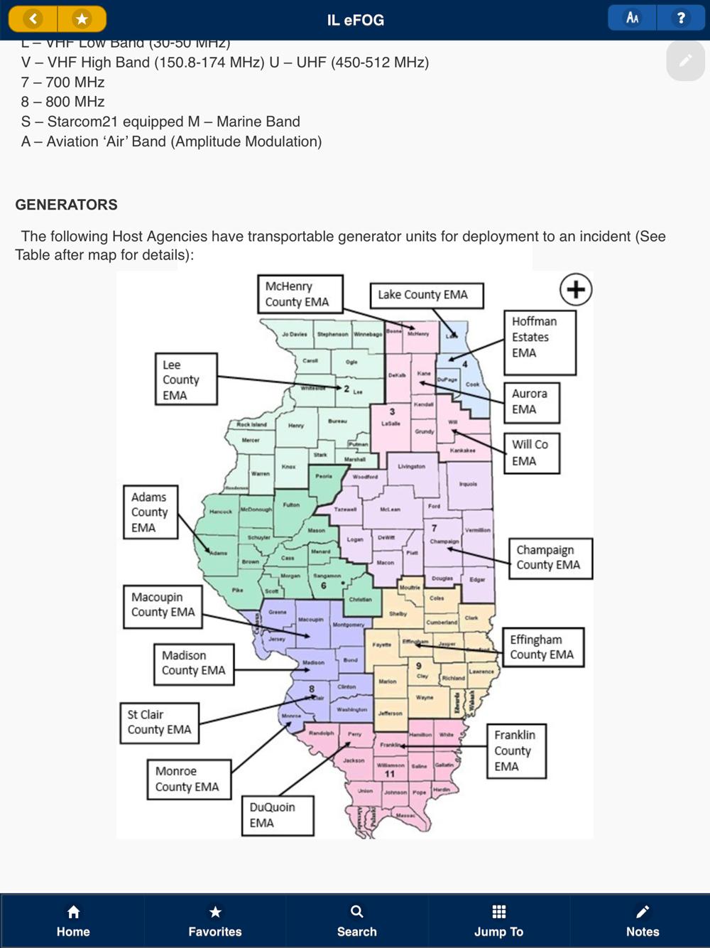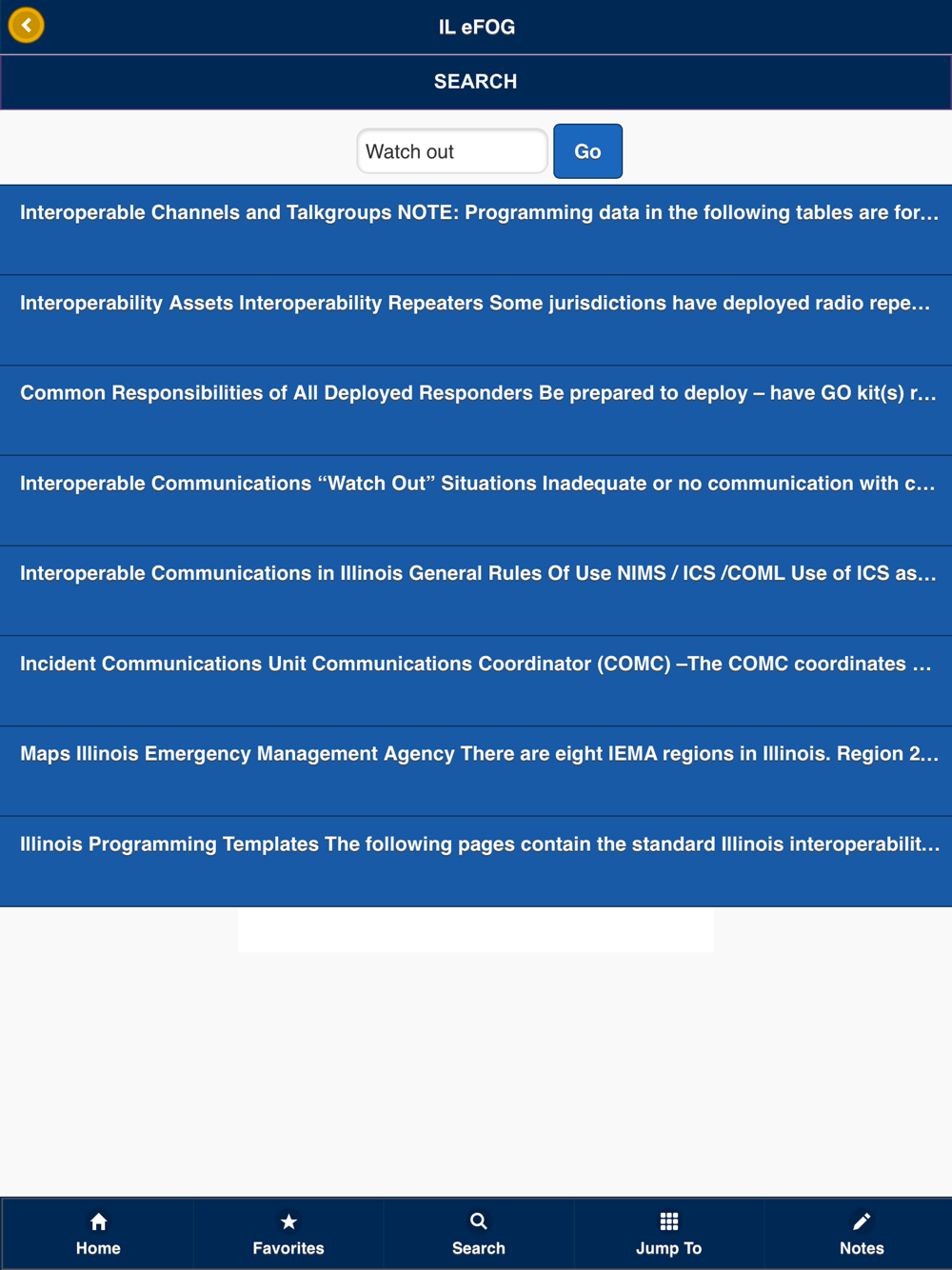 The IL eFOG mobile app gives users easy access to public safety communications information, offering a content index with links for quick jumps to reference sections, tables, figures, or images. The ability to save Favorites and create in-line notes enables personalized access to critical information. IL eFOG can be downloaded and then taken to the field as an offline reference, to be used without the need of an Internet connection.