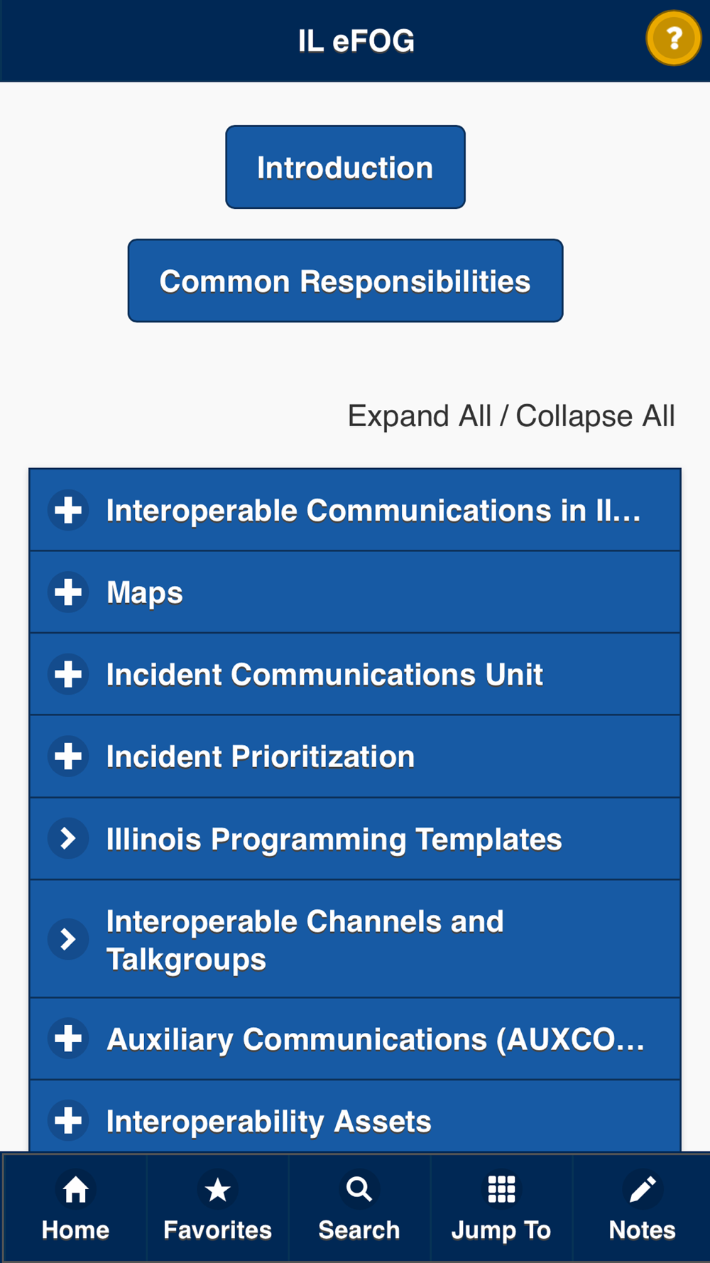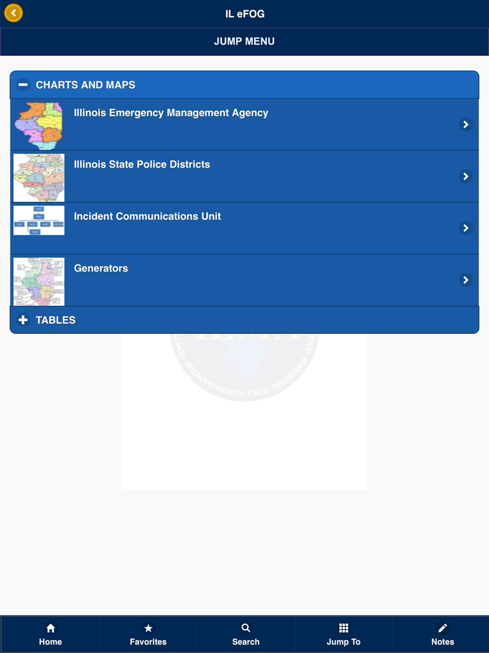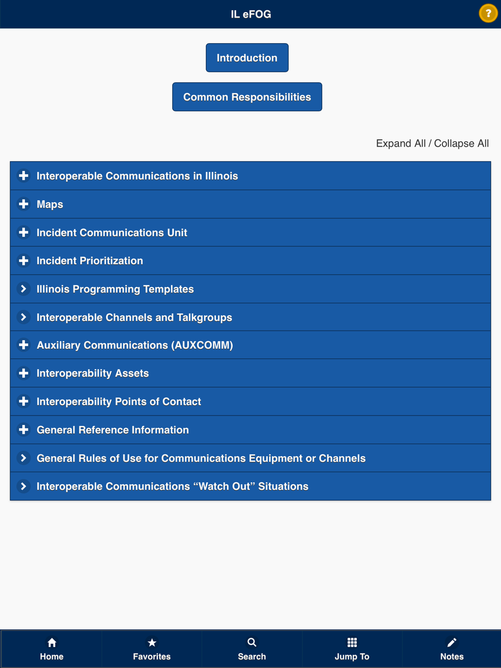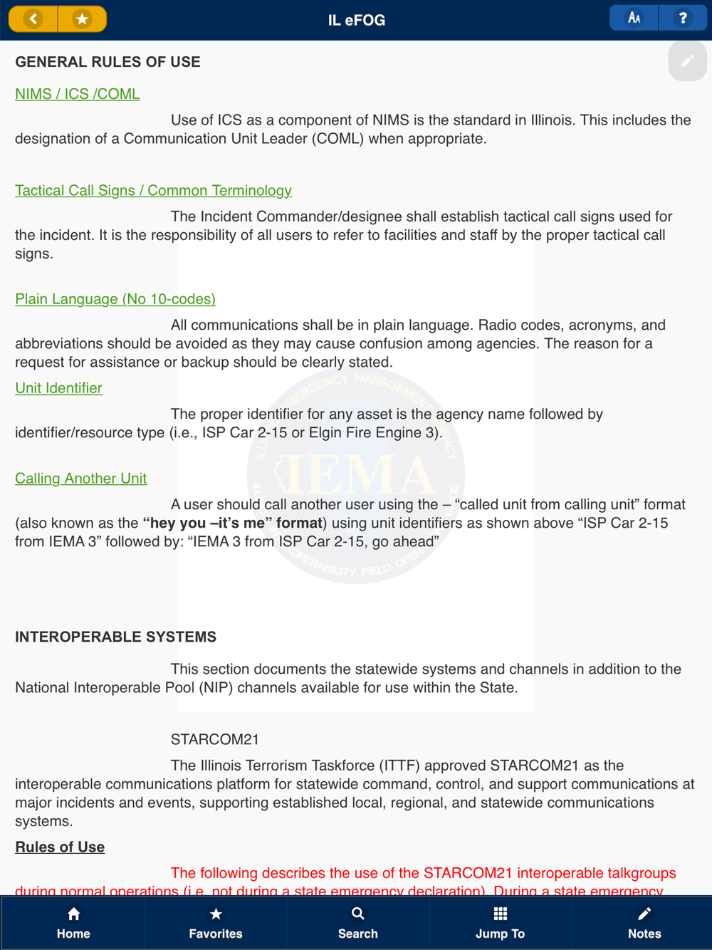 DescriptionThe IL eFOG mobile app is an electronic reference of the Illinois Interoperability Field Operations Guide. The IL eFOG is a technical reference for emergency communications planning and for radio technicians responsible for radios that will be used in disaster response. It includes rules and regulations for use by the State of Illinois and other interoperability channels, tables of frequencies and standard channel names, and other reference material.