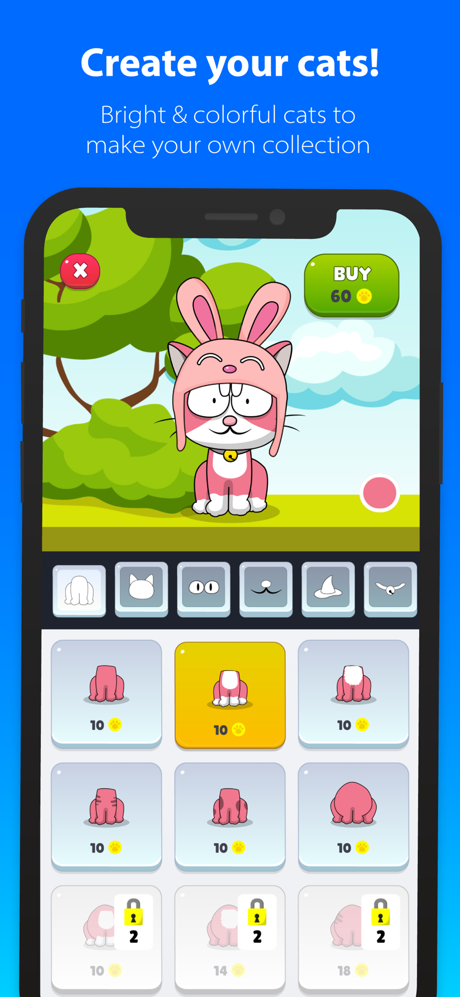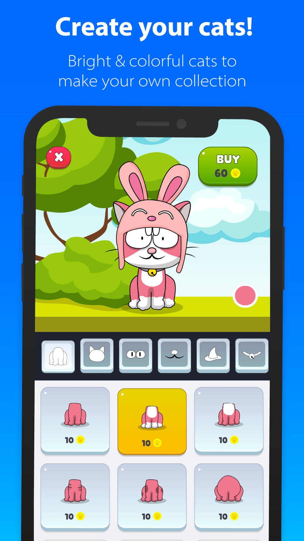 Cats Empire lets you to create multiple funny cats! Use hundred of hats and a lot of features to make them awesome. Feed to win coins and color them as many times as you want! Unlock the worlds to place your cats and enjoy!