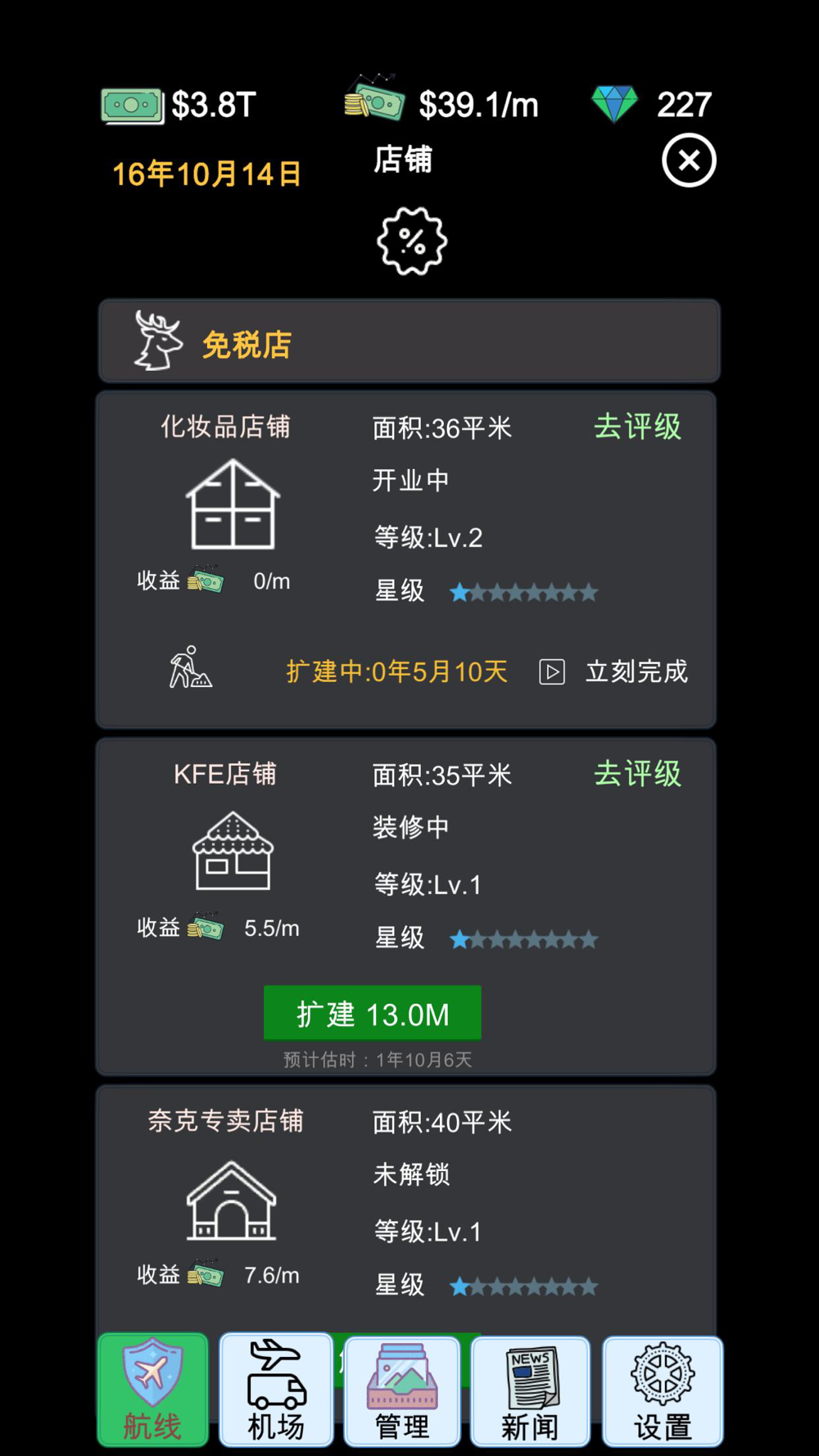 在游戏里面你可以随意的新建机场,增加新的航线,前提是你能赚的足够的现金流,你也可以在机场里面开启各种免税店,前提是你的机场有足够的流动人员,想办法让你的机场遍及世界的每一个热门尝试把,让你的航空公司成为世界500强吧