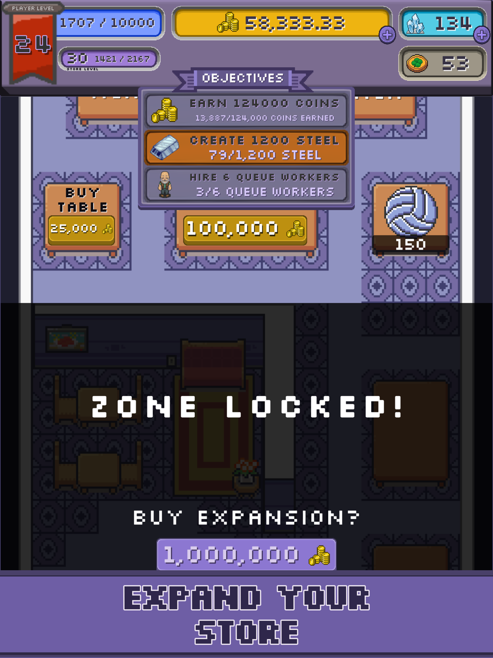 Your store starts out small, but as you earn more coins you can expand the size of your store as well as buy more tables to stock items. Make sure your tables are always stocked so that customers can spend their hard earned money at your store.
