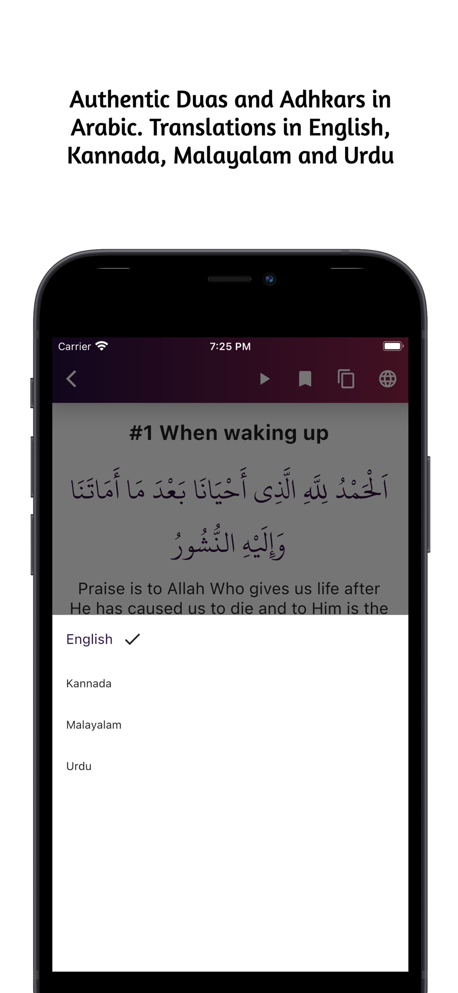 • Arabic with transliteration, English, Malayalam, Kannada and Urdu translations.
