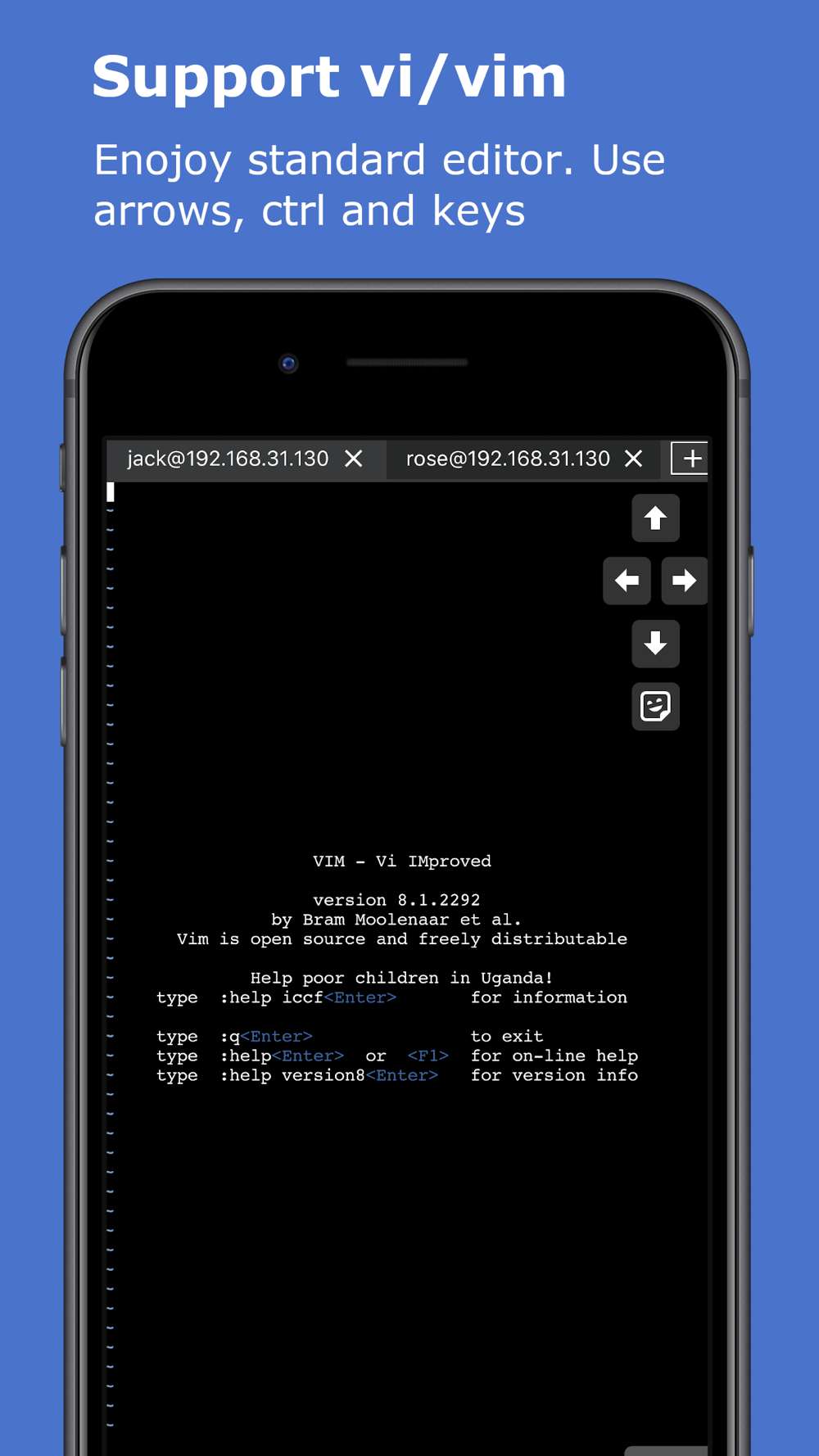 * Reactive editor. Edit your documents with vi/vim just like on the computer. Support CTRL and arrow keys.