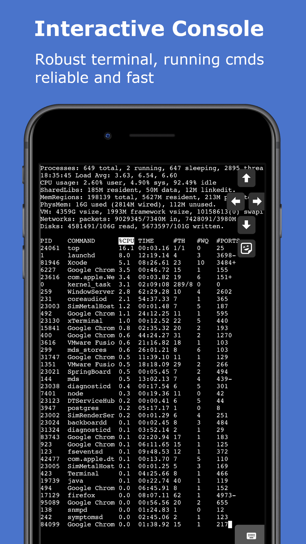 * Interactive console. Robust terminal, running commands reliable and fast. Eg: running top command to monitor realtime system status. tail -f log file.