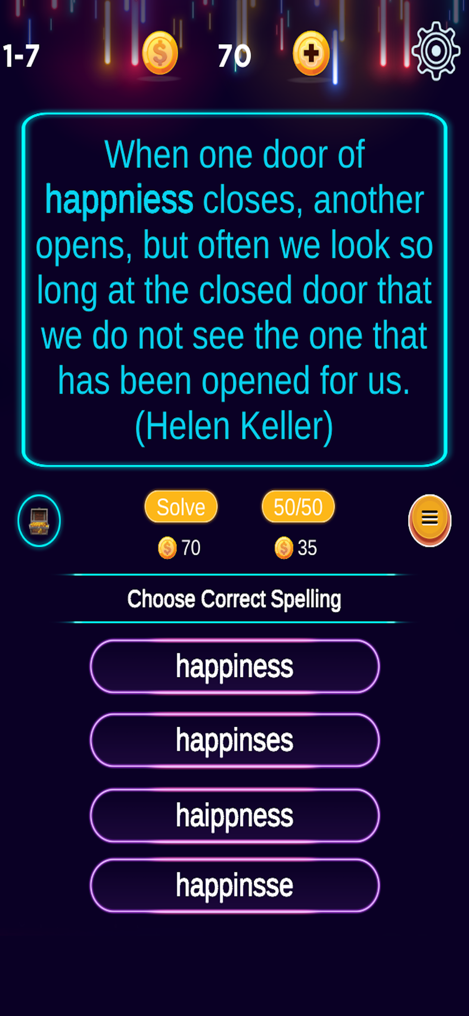 Guess the spelling learning with motivational quotes. Education with fun you can learn English spelling without any stress and your motivation level goes up every morning. It is meaningful and every day useful, productive and increases your English language level with guess the spelling.